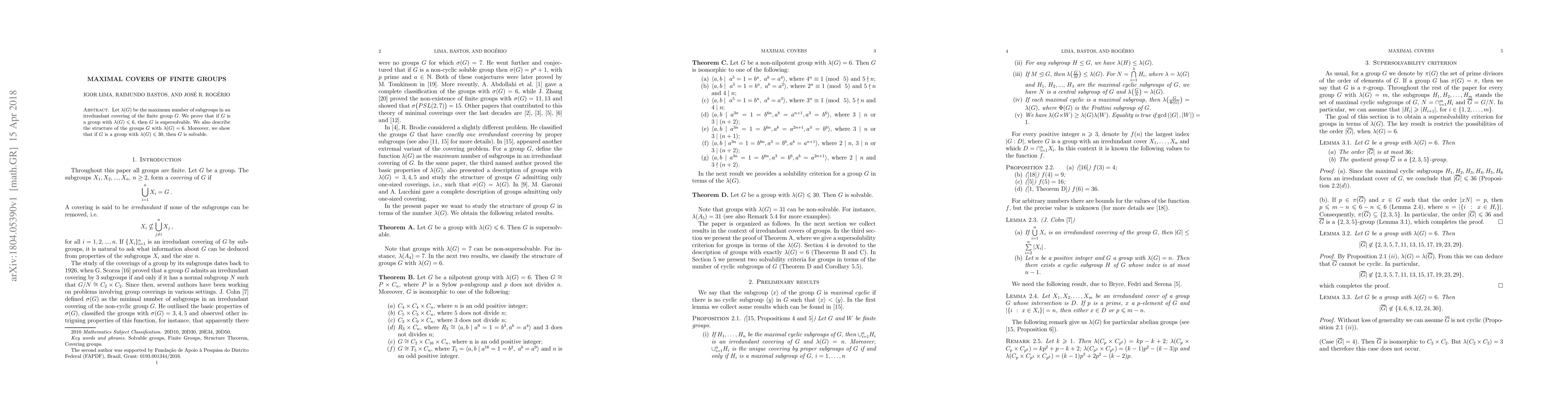 This paper proves that finite groups with a maximal number of subgroups in an irredundant covering ($\lambda(G)$) less than or equal to 6 are supersolvable, and describes the structure of those with $\lambda(G)=6$. Additionally, it shows that groups with $\lambda(G) \leqslant 30$ are solvable.