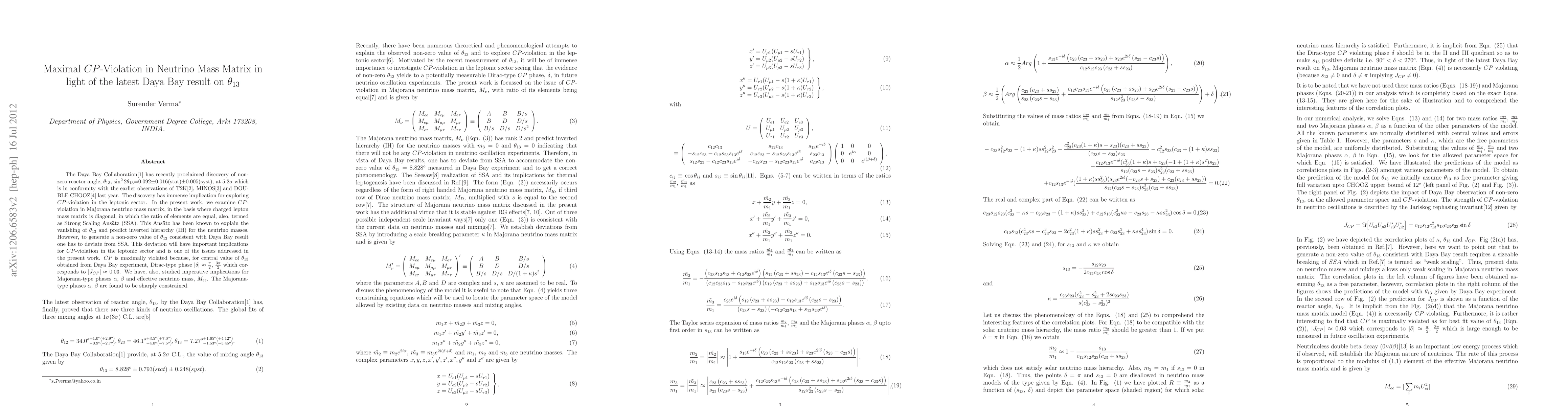 The Daya Bay Collaboration (An et al) has recently proclaimed discovery of non-zero reactor angle, $\theta_{13}$, $\sin^{2}2\theta_{13}$=0.092$\pm$0.016(stat)$\pm$0.005(syst), at $5.2\sigma$ which is in conformity with the earlier observations of Abe et al, Adamson et al and Kerret et al last year. The discovery has immense implication for exploring CP-violation in the leptonic sector. In the present work, we examine CP-violation in Majorana neutrino mass matrix, in the basis where charged lepton mass matrix is diagonal, in which the ratio of elements are equal, also, termed as Strong Scaling Ans$\ddot{a}$tz (SSA). This Ans$\ddot{a}$tz has been known to explain the vanishing of $\theta_{13}$ and predict inverted hierarchy (IH) for the neutrino masses. However, to generate a non-zero value of $\theta_{13}$ consistent with Daya Bay result one has to deviate from SSA. This deviation will have important implications for CP-violation in the leptonic sector and is one of the issues addressed in the present work. CP is maximally violated because, for central value of $\theta_{13}$ obtained from Daya Bay experiment, Dirac-type phase $|\delta|\approx \frac{\pi}{2}$, $\frac{3 \pi}{2}$ which corresponds to $|J_{CP}|\approx0.03$. We have, also, studied imperative implications for Majorana-type phases $\alpha$, $\beta$ and effective neutrino mass, $M_{ee}$. The Majorana-type phases $\alpha$, $\beta$ are found to be sharply constrained.