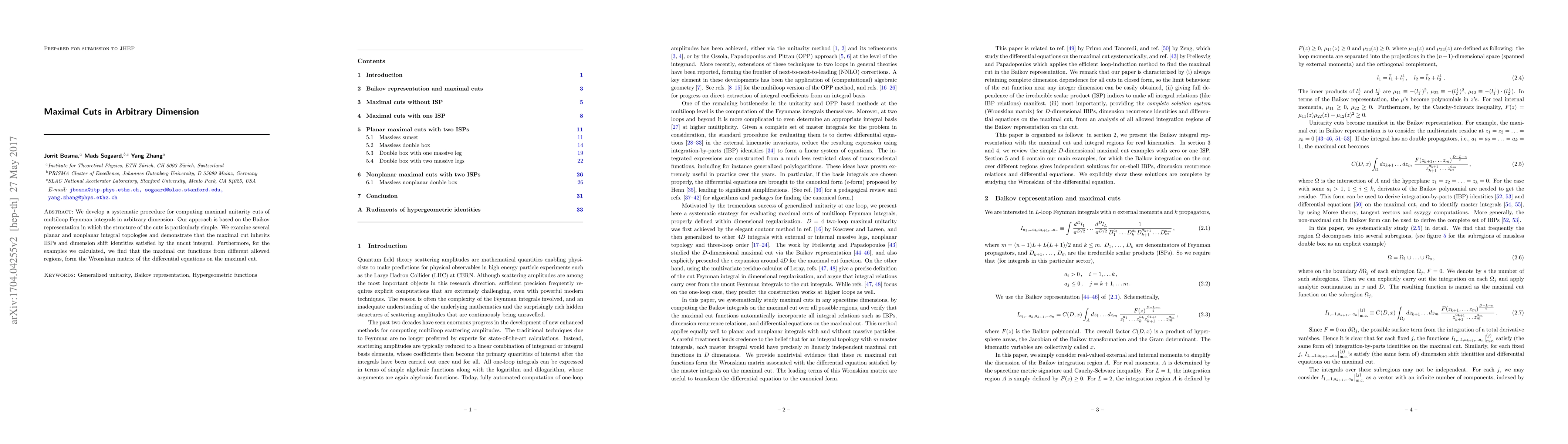 We develop a systematic procedure for computing maximal unitarity cuts of multiloop Feynman integrals in arbitrary dimension. Our approach is based on the Baikov representation in which the structure of the cuts is particularly simple. We examine several planar and nonplanar integral topologies and demonstrate that the maximal cut inherits IBPs and dimension shift identities satisfied by the uncut integral. Furthermore, for the examples we calculated, we find that the maximal cut functions from different allowed regions, form the Wronskian matrix of the differential equations on the maximal cut.