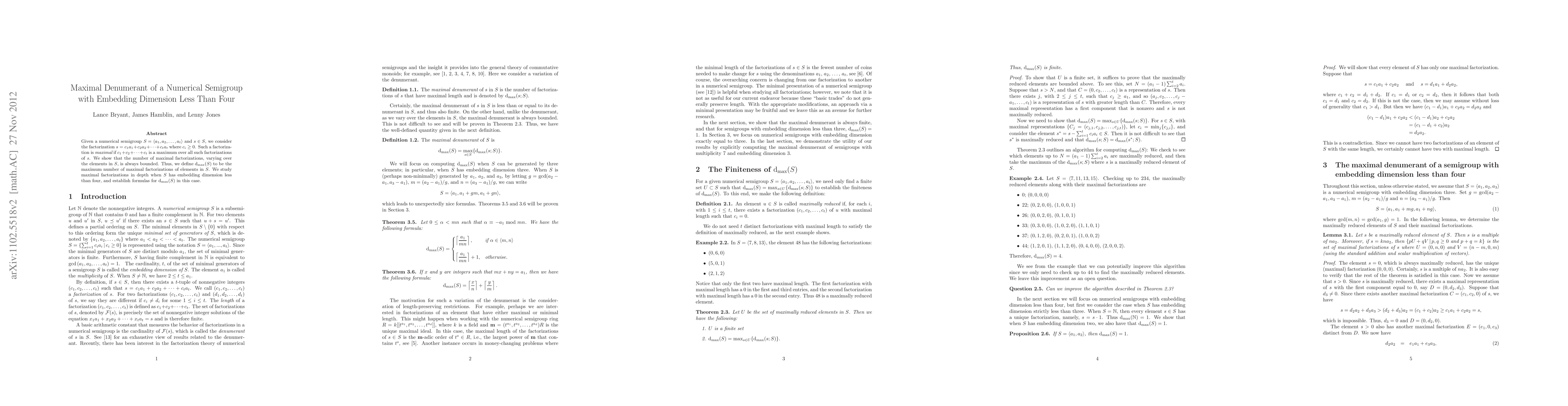 This paper studies the maximal denumerant of a numerical semigroup with embedding dimension less than four, establishing formulas for the maximum number of maximal factorizations in this case.