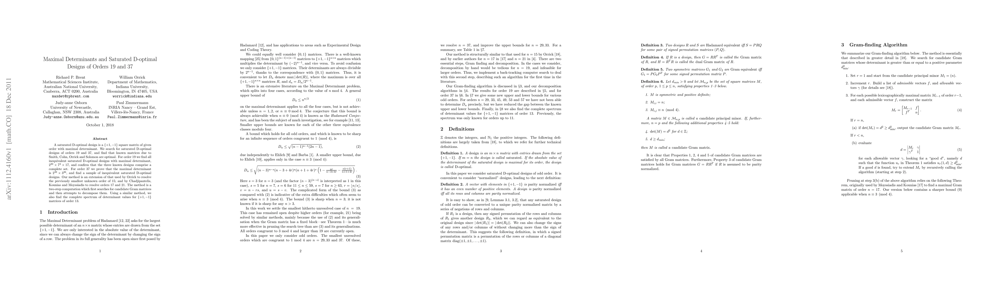 This paper investigates saturated D-optimal designs for orders 19 and 37, confirming the optimality of known matrices and finding all inequivalent designs for order 19. It also determines the maximal determinant for order 37 and provides a sample of optimal designs.