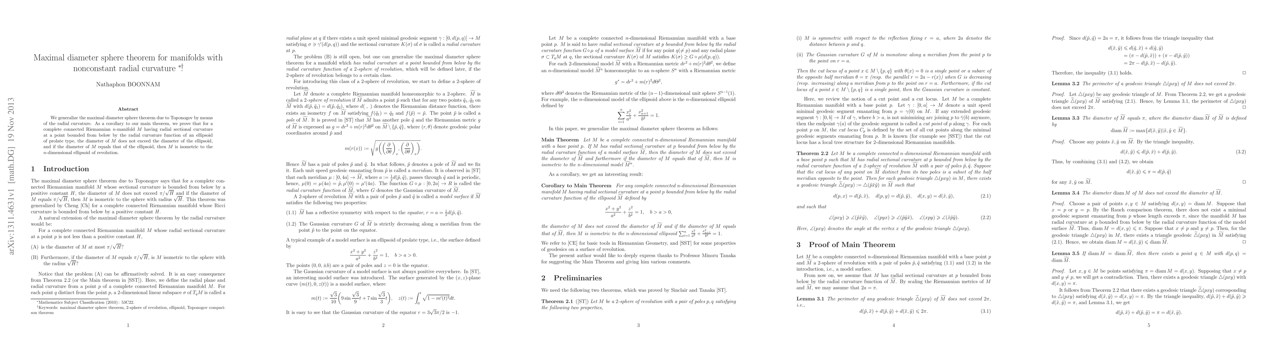 This paper generalizes Toponogov's maximal diameter sphere theorem using radial curvature, proving that a complete connected Riemannian manifold with radial sectional curvature bounded below by that of a prolate ellipsoid has a diameter no greater than that of the ellipsoid, with equality implying isometry to the ellipsoid of revolution.