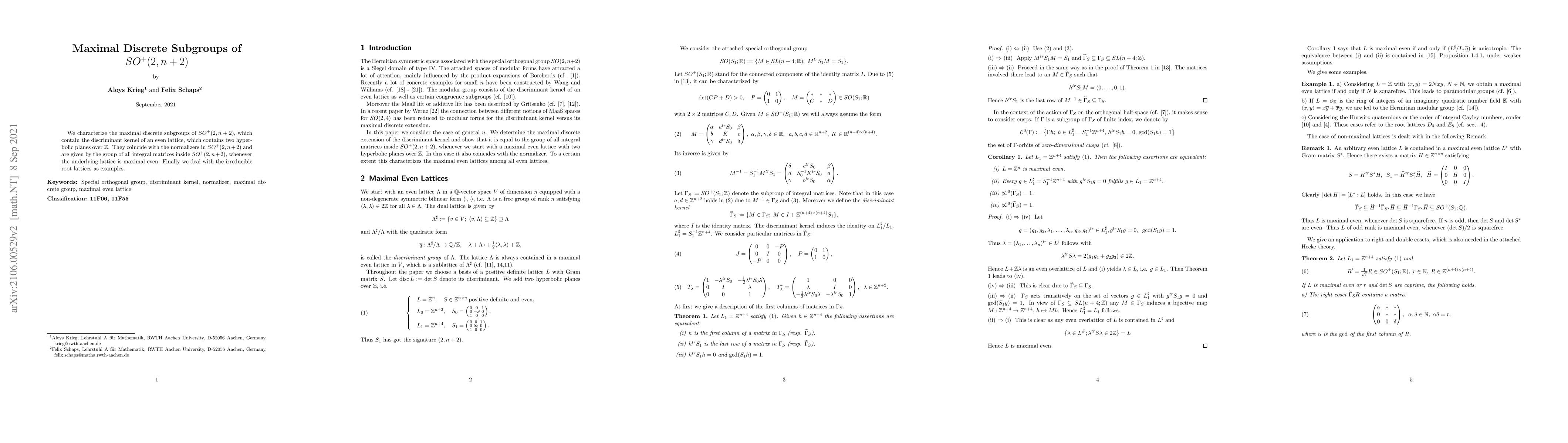 This paper characterizes maximal discrete subgroups of $SO^+(2,n+2)$ that contain the discriminant kernel of an even lattice with two hyperbolic planes over $\mathbb{Z}$. These subgroups coincide with the normalizers in $SO^+(2,n+2)$ and are given by integral matrices when the lattice is maximal even, with examples provided for irreducible root lattices.