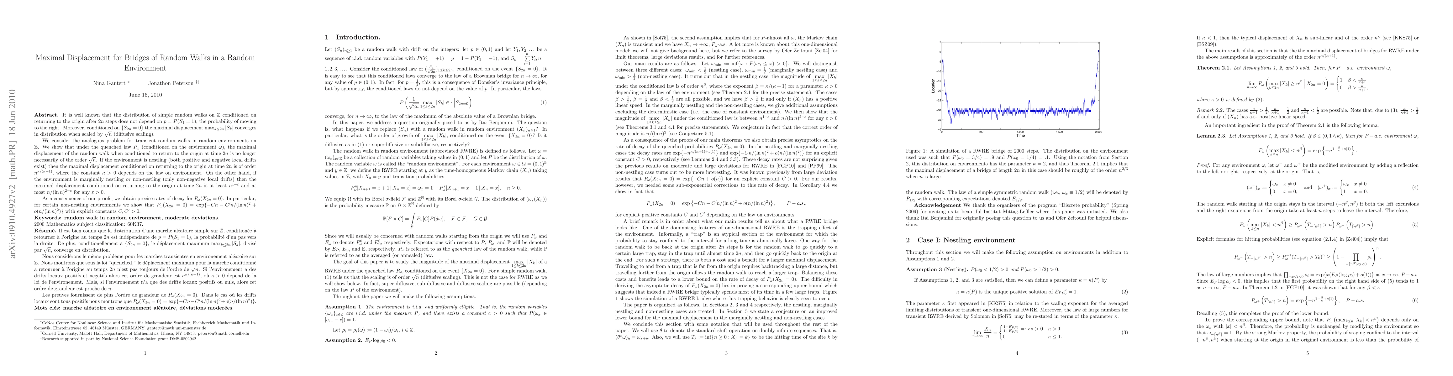 This research explores how the maximal displacement of random walks on integer lattice Z varies with environment conditions, contrasting it with uniform random walks. It finds that in random environments, the maximal displacement's order isn't simply $sqrt{n}$ as in uniform walks. The displacement order depends on whether the environment is nestling, marginally nestling, or non-nestling, with precise rates of decay for returning to the origin at time 2n derived. The study also reveals explicit decay constants for certain non-nestling environments.