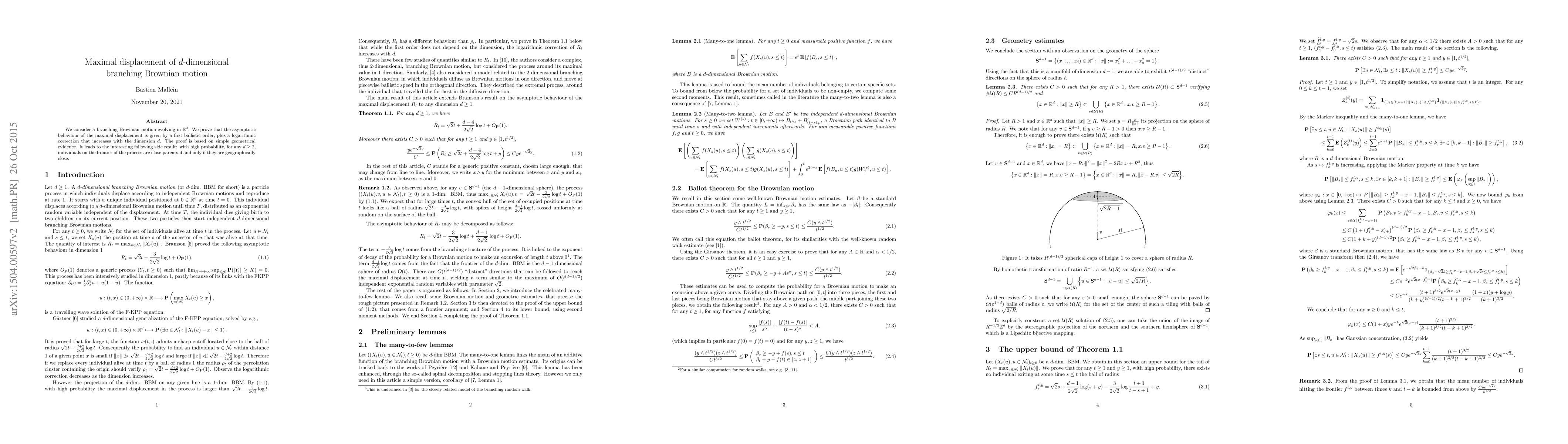 Summary: This paper proves that the maximal displacement in $d$-dimensional branching Brownian motion exhibits a first ballistic order plus a logarithmic correction dependent on dimension $d$. Additionally, it finds that individuals on the frontier are likely close parents if they are geographically close with high probability.