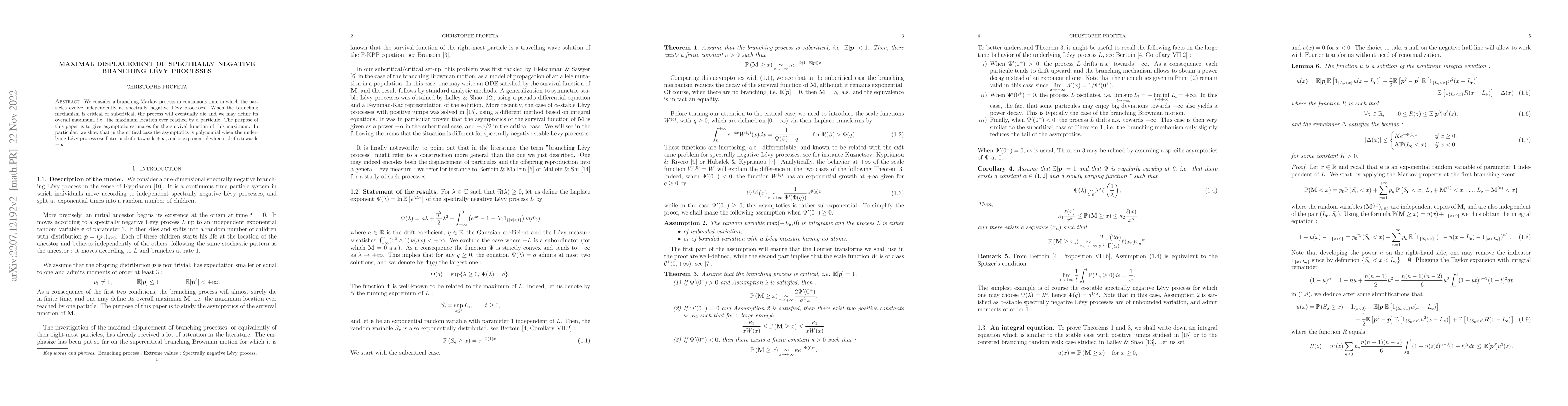 This paper investigates the maximal displacement of particles in a critical or subcritical branching Markov process driven by spectrally negative Lévy processes. It provides asymptotic estimates for the survival function of the maximum location, showing polynomial asymptotics in the critical case when the Lévy process trends to $+\infty$ and exponential trends when it drifts towards $-\infty$.