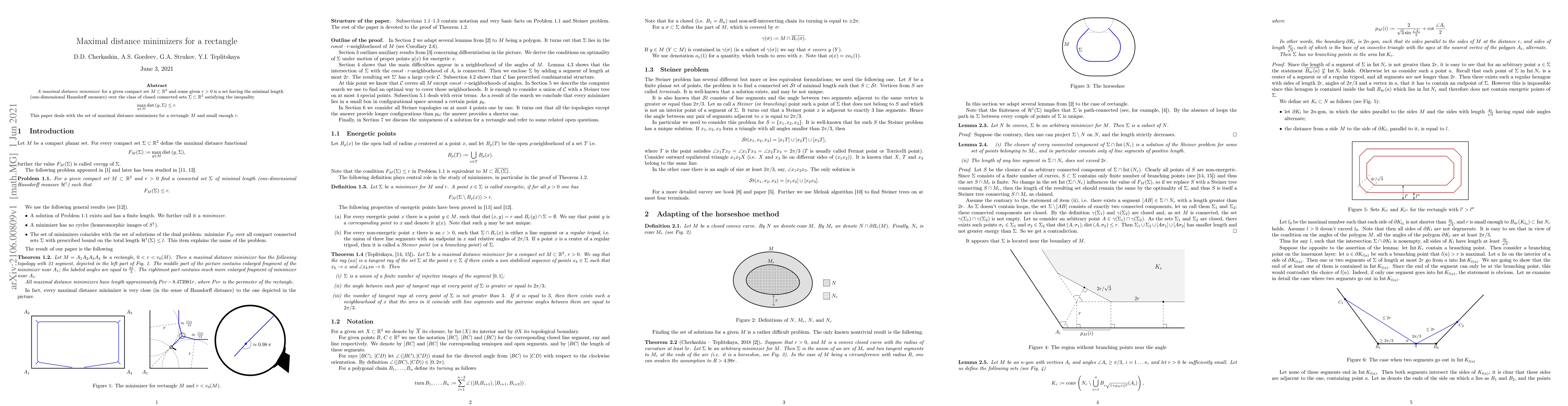 \emph{A maximal distance minimizer} for a given compact set $M \subset \mathbb{R}^2$ and some given $r > 0$ is a set having the minimal length (one-dimensional Hausdorff measure) over the class of closed connected sets $\Sigma \subset \mathbb{R}^2$ satisfying the inequality \[ \max_{y\in M} dist (y, \Sigma) \leq r. \] This paper deals with the set of maximal distance minimizers for a rectangle $M$ and small enough $r$.