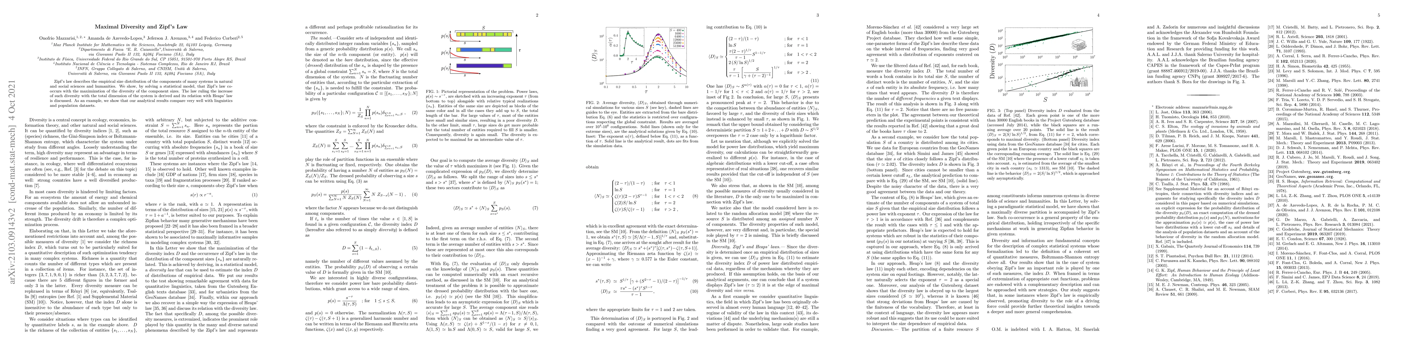 This paper demonstrates that Zipf's law emerges when the diversity of component sizes in various systems is maximized. It derives a law governing this diversity's growth with system size and discusses its connection to Heaps' law, supported by successful comparisons with linguistic datasets.