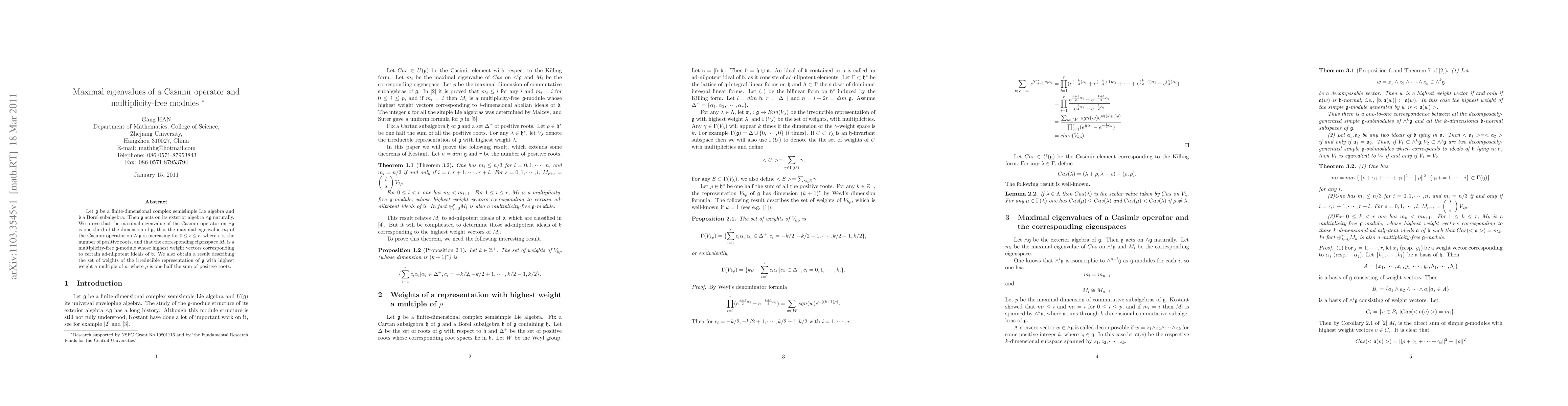 The paper finds that the Casimir operator on a semisimple Lie algebra's exterior algebra has a maximal eigenvalue one-third its dimension, and explores the implications for multiplicity-free modules and irreducible representations with specific highest weights.