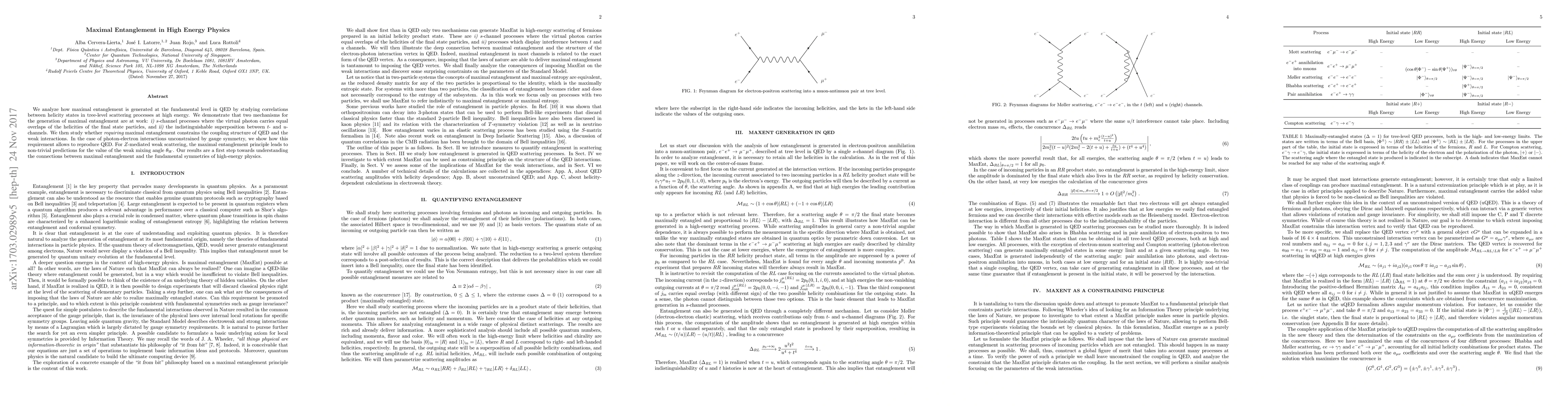 We analyze how maximal entanglement is generated at the fundamental level in QED by studying correlations between helicity states in tree-level scattering processes at high energy. We demonstrate that two mechanisms for the generation of maximal entanglement are at work: i) $s$-channel processes where the virtual photon carries equal overlaps of the helicities of the final state particles, and ii) the indistinguishable superposition between $t$- and $u$-channels. We then study whether requiring maximal entanglement constrains the coupling structure of QED and the weak interactions. In the case of photon-electron interactions unconstrained by gauge symmetry, we show how this requirement allows reproducing QED. For $Z$-mediated weak scattering, the maximal entanglement principle leads to non-trivial predictions for the value of the weak mixing angle $\theta_W$. Our results are a first step towards understanding the connections between maximal entanglement and the fundamental symmetries of high-energy physics.