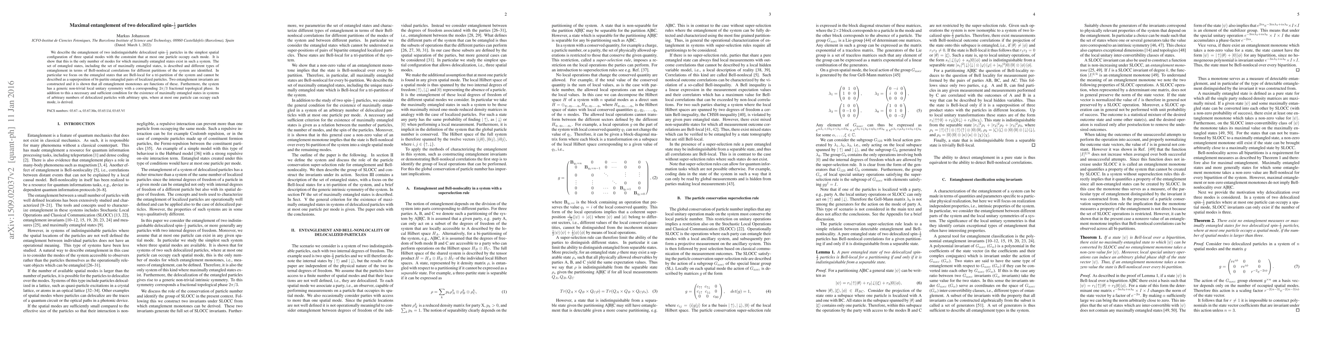 We describe the entanglement of two indistinguishable delocalized spin-$\frac{1}{2}$ particles in the simplest spatial configuration of three spatial modes with the constraint that at most one particle occupy each mode. It is show that this is the only number of modes for which maximally entangled states exist in such a system. The set of entangled states, including the set of maximally entangled states, is described and different types of entanglement in terms of Bell-nonlocal correlations for different partitions of the system are identified. In particular we focus on the entangled states that are Bell-local for a tri-partition of the system and cannot be described as a superposition of bi-partite entangled pairs of localized particles. Two entanglement invariants are constructed and it is shown that all entanglement monotones are functions of these. Furthermore, the system has a generic non-trivial local unitary symmetry with a corresponding $2\pi/3$ fractional topological phase. In addition to this a necessary and sufficient condition for the existence of maximally entangled states in systems of arbitrary numbers of delocalized particles with arbitrary spin, where at most one particle can occupy each mode, is derived.