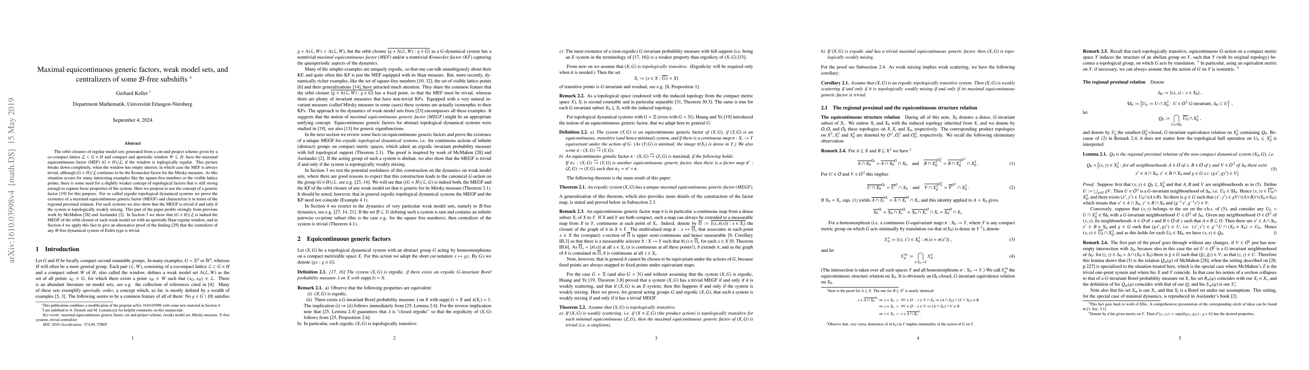 The orbit closures of regular model sets generated from a cut-and-project scheme given by a co-compact lattice $\mathcal{L}\subset G\times H$ and compact and aperiodic window $W\subseteq H$, have the maximal equicontinuous factor (MEF) $(G\times H)/\mathcal{L}$, if the window is toplogically regular. This picture breaks down completely, when the window has empty interior, in which case the MEF is always trivial, although $(G\times H)/\mathcal{L}$ continues to be the Kronecker factor for the Mirsky measure. As this situation occurs for many interesting examples like the square-free numbers or the visible lattice points, there is some need for a slightly weaker concept of topological factors that is still strong enough to capture basic properties of the system. Here we propose to use the concept of a generic factor \cite{HuangYe2012} for this purpose. For so called ergodic topological dynamical systems we prove the existence of a maximal equicontinuous generic factor (MEGF) and characterize it in terms of the regional proximal relation. For such systems we also show that the MEGF is trivial if and only if the system is topologically weakly mixing. This part of the paper profits strongly from previous work by McMahon \cite{McMahon1978} and Auslander \cite{Auslander1988}. In Section 3 we show that $(G\times H)/\mathcal{L}$ is indeed the MEGF of the orbit closure of each weak model set with an aperiodic Haar regulaar window, and in Section 4 we apply this fact to give an alternative proof of the finding \cite{Mentzen2017} that the centralizer of any $\mathcal{B}$-free dynamical system of Erd\"os type is trivial.