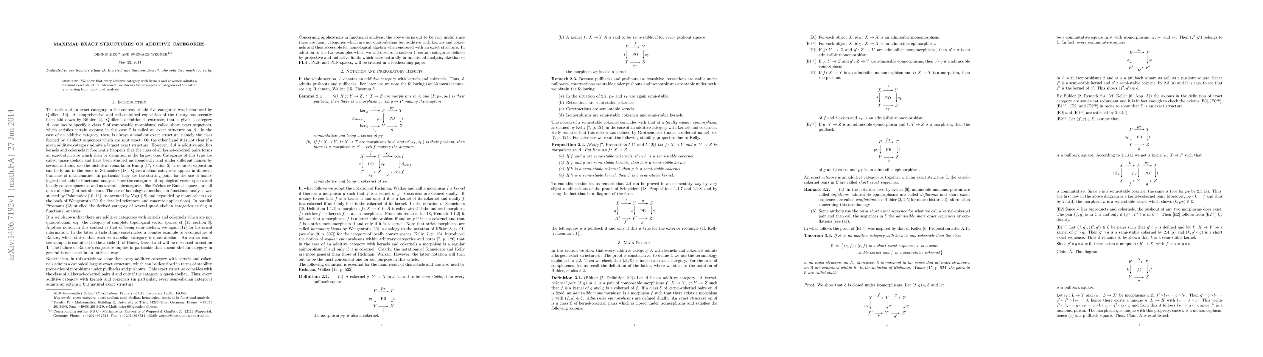 This paper demonstrates that any additive category equipped with kernels and cokernels can be endowed with a maximal exact structure. It also provides two examples from functional analysis illustrating this concept.