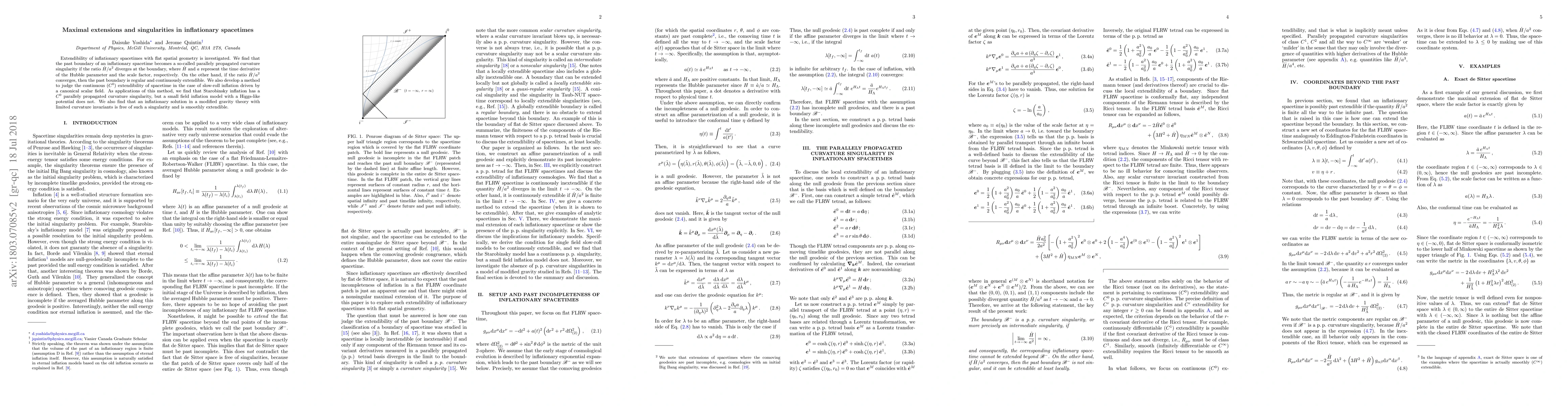 Extendibility of inflationary spacetimes with flat spatial geometry is investigated. We find that the past boundary of an inflationary spacetime becomes a so-called parallely propagated curvature singularity if the ratio $\dot{H}/a^2$ diverges at the boundary, where $\dot{H}$ and $a$ represent the time derivative of the Hubble parameter and the scale factor, respectively. On the other hand, if the ratio $\dot{H}/a^2$ converges, then the past boundary is regular and continuously extendible. We also develop a method to judge the continuous ($C^0$)extendibility of spacetime in the case of slow-roll inflation driven by a canonical scalar field. As applications of this method, we find that Starobinsky inflation has a $C^0$ parallely propagated curvature singularity, but a small field inflation model with a Higgs-like potential does not. We also find that an inflationary solution in a modified gravity theory with limited curvature invariants is free of such a singularity and is smoothly extendible.