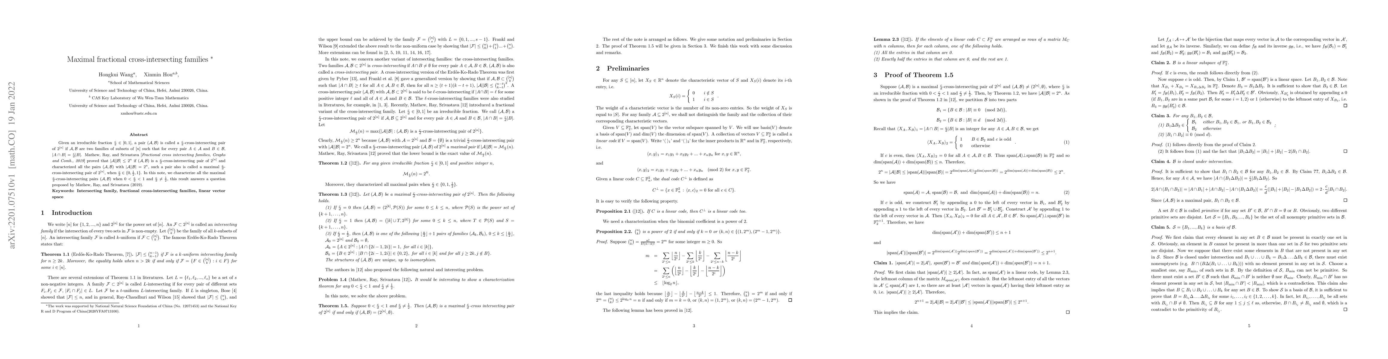 Given an irreducible fraction $\frac{c}{d} \in [0,1]$, a pair $(\mathcal{A},\mathcal{B})$ is called a $\frac{c}{d}$-cross-intersecting pair of $2^{[n]}$ if $\mathcal{A}, \mathcal{B}$ are two families of subsets of $[n]$ such that for every pair $A \in\mathcal{A}$ and $B\in\mathcal{B}$, $|A \cap B|= \frac{c}{d}|B|$. Mathew, Ray, and Srivastava [{\it\small Fractional cross intersecting families, Graphs and Comb., 2019}] proved that $|\mathcal{A}||\mathcal{B}|\le 2^n$ if $(\mathcal{A}, \mathcal{B})$ is a $\frac{c}{d}$-cross-intersecting pair of $2^{[n]}$ and characterized all the pairs $(\mathcal{A},\mathcal{B})$ with $|\mathcal{A}||\mathcal{B}|=2^n$, such a pair also is called a maximal $\frac cd$-cross-intersecting pair of $2^{[n]}$, when $\frac cd\in\{0,\frac12, 1\}$. In this note, we characterize all the maximal $\frac cd$-cross-intersecting pairs $(\mathcal{A},\mathcal{B})$ when $0<\frac{c}{d}<1$ and $\frac cd\not=\frac 12$, this result answers a question proposed by Mathew, Ray, and Srivastava (2019).