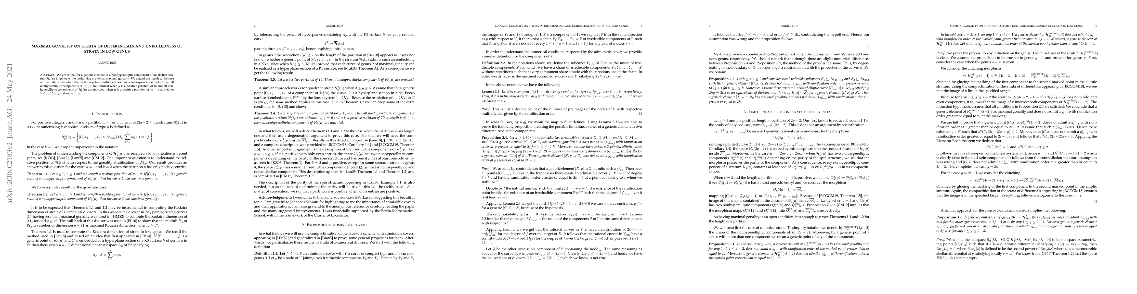 We prove that for a generic element in a nonhyperelliptic component of an abelian stratum $\mathcal{H}_g(\mu)$ in genus $g$, the underlying curve has maximal gonality. We extend this result to the case of quadratic strata when the partition $\mu$ has positive entries. As a consequence we deduce that all nonhyperelliptic components of $\mathcal{H}_9(\mu)$ are uniruled when $\mu$ is a positive partition of 16 and all nonhyperelliptic components of $\mathcal{H}^2_g(\mu)$ are uniruled when $\mu$ is a positive partition of $4g-4$ and either $3\leq g\leq5$ or $g=6$ and $l(\mu)\geq 4$.