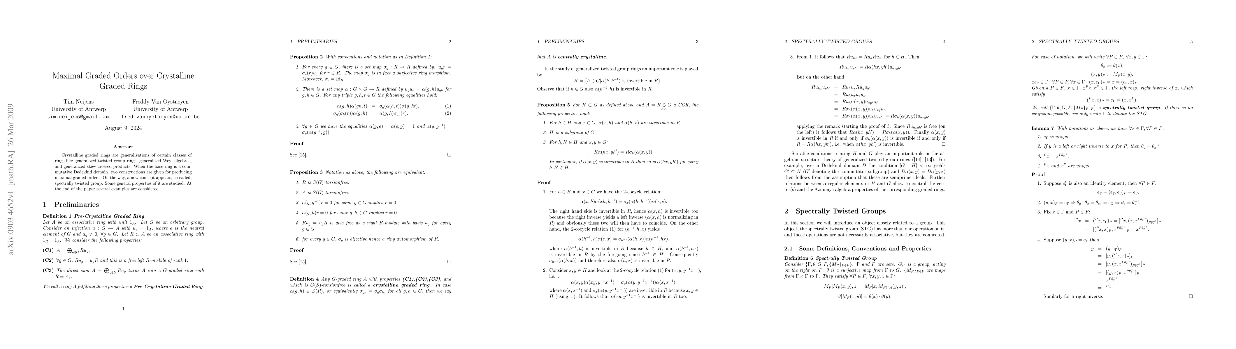 This paper explores maximal graded orders over crystalline graded rings, extending to new constructions when the base ring is a commutative Dedekind domain, introducing the concept of spectrally twisted groups, and providing examples to illustrate these concepts.