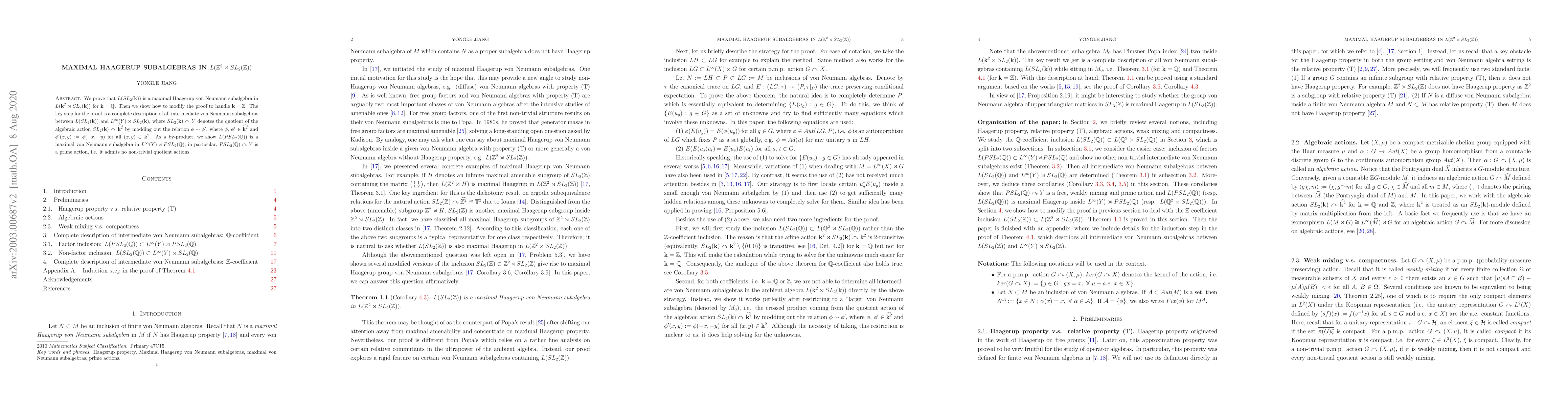 We prove that $L(SL_2(\textbf{k}))$ is a maximal Haagerup von Neumann subalgebra in $L(\textbf{k}^2\rtimes SL_2(\textbf{k}))$ for $\textbf{k}=\mathbb{Q}$. Then we show how to modify the proof to handle $\textbf{k}=\mathbb{Z}$. The key step for the proof is a complete description of all intermediate von Neumann subalgebras between $L(SL_2(\textbf{k}))$ and $L^{\infty}(Y)\rtimes SL_2(\textbf{k})$, where $SL_2(\textbf{k})\curvearrowright Y$ denotes the quotient of the algebraic action $SL_2(\textbf{k})\curvearrowright \widehat{\textbf{k}^2}$ by modding out the relation $\phi\sim \phi'$, where $\phi$, $\phi'\in \widehat{\textbf{k}^2}$ and $\phi'(x, y):=\phi(-x, -y)$ for all $(x, y)\in \textbf{k}^2$. As a by-product, we show $L(PSL_2(\mathbb{Q}))$ is a maximal von Neumann subalgebra in $L^{\infty}(Y)\rtimes PSL_2(\mathbb{Q})$; in particular, $PSL_2(\mathbb{Q})\curvearrowright Y$ is a prime action, i.e. it admits no non-trivial quotient actions.