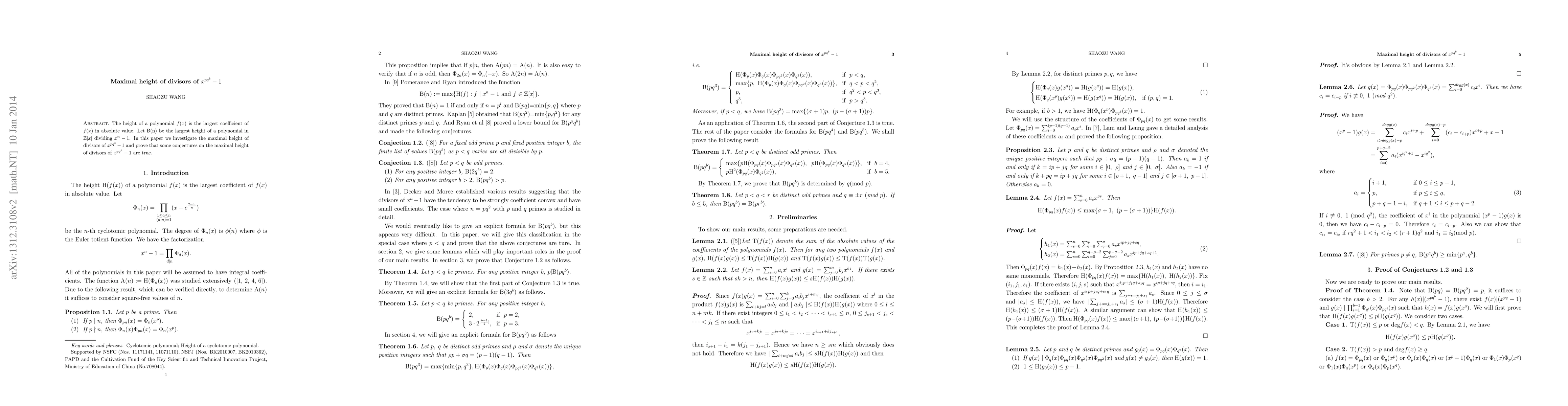 The height of a polynomial $f(x)$ is the largest coefficient of $f(x)$ in absolute value. Let B(n) be the largest height of a polynomial in $\mathbb{Z}[x]$ dividing $x^n-1$. In this paper we investigate the maximal height of divisors of $x^{pq^b}-1$ and prove that some conjectures on the maximal height of divisors of $x^{pq^b}-1$ are true.