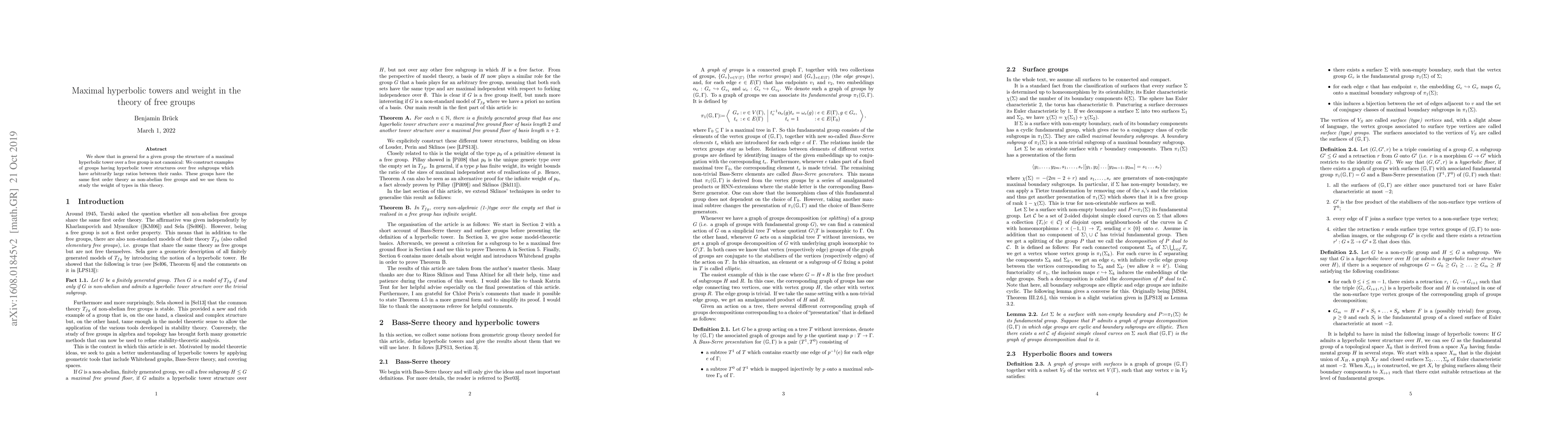 This paper demonstrates that maximal hyperbolic towers over free groups lack a canonical structure, presenting examples with varying rank ratios. It also explores the weight of types in the first-order theory of these groups, showing they share properties with non-abelian free groups.