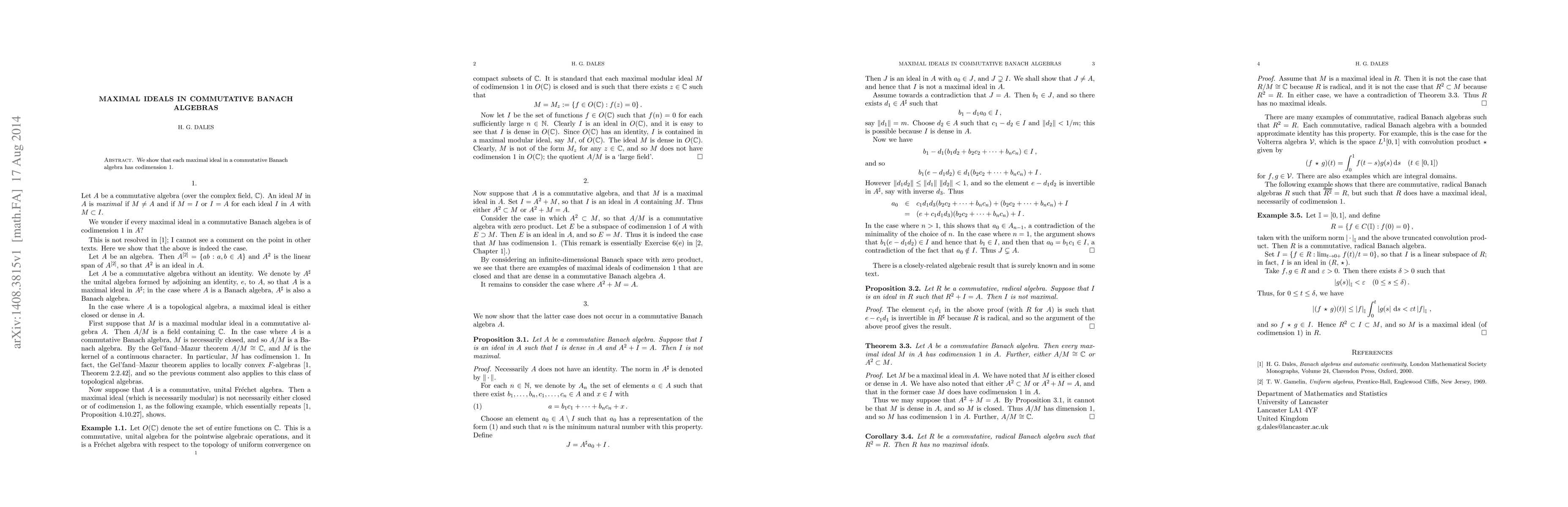 We show that each maximal ideal in a commutative Banach algebra has codimension 1.