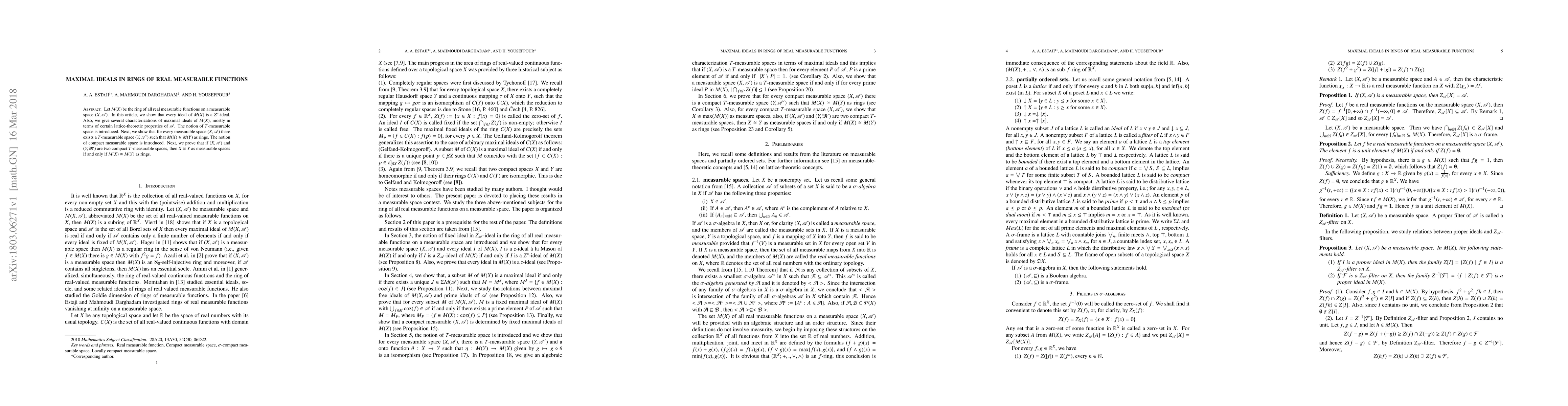 This paper explores the structure of ideals in the ring of real measurable functions on a measurable space, proving that every ideal is a $Z^{\circ}$-ideal. It characterizes maximal ideals in terms of lattice-theoretic properties and introduces the concept of $T$-measurable spaces, establishing a ring isomorphism between $M(X)$ and $M(Y)$ for certain measurable spaces.