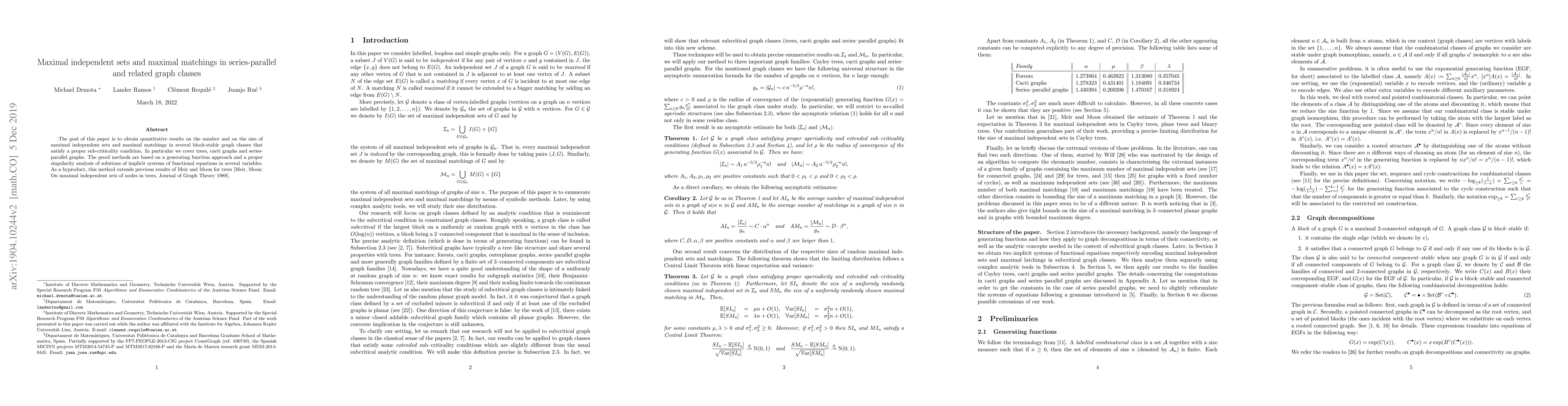 This paper quantitatively analyzes the number and size of maximal independent sets and maximal matchings in block-stable graph classes, including trees, cacti, and series-parallel graphs. It employs generating functions and singularity analysis to extend previous results for trees.