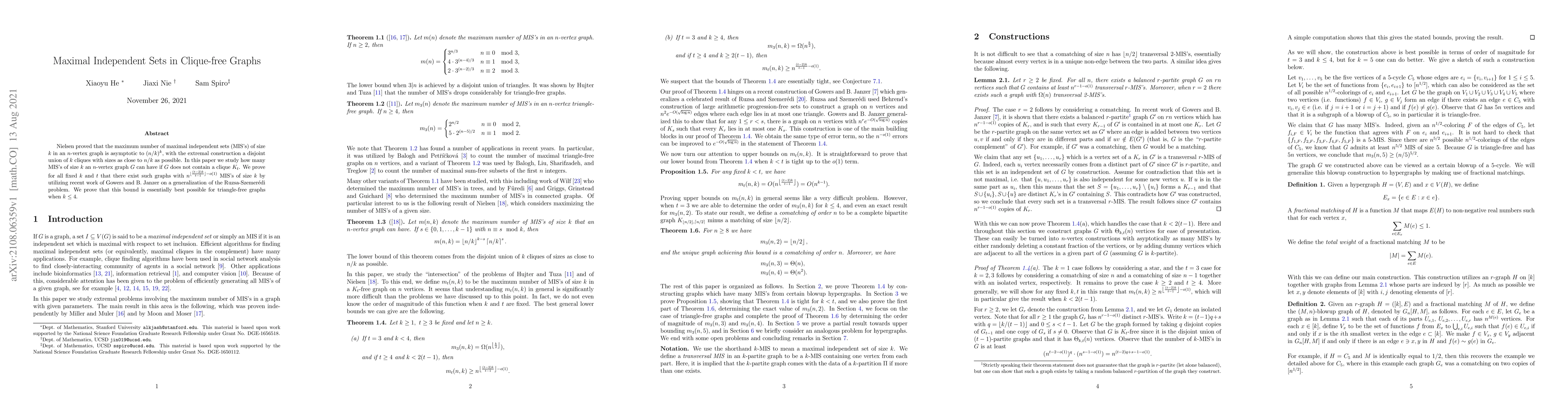 Nielsen proved that the maximum number of maximal independent sets (MIS's) of size $k$ in an $n$-vertex graph is asymptotic to $(n/k)^k$, with the extremal construction a disjoint union of $k$ cliques with sizes as close to $n/k$ as possible. In this paper we study how many MIS's of size $k$ an $n$-vertex graph $G$ can have if $G$ does not contain a clique $K_t$. We prove for all fixed $k$ and $t$ that there exist such graphs with $n^{\lfloor\frac{(t-2)k}{t-1}\rfloor-o(1)}$ MIS's of size $k$ by utilizing recent work of Gowers and B. Janzer on a generalization of the Ruzsa-Szemer\'edi problem. We prove that this bound is essentially best possible for triangle-free graphs when $k\le 4$.