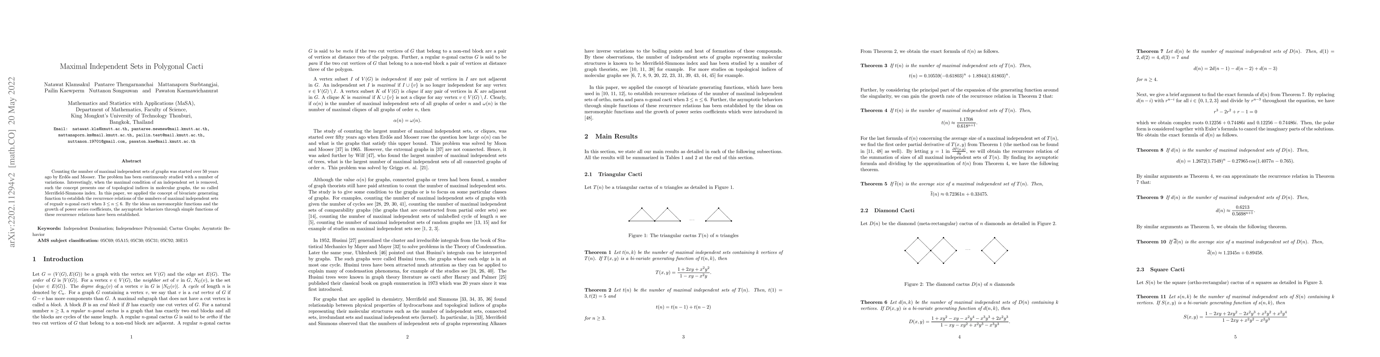 This paper develops recurrence relations for counting maximal independent sets in polygonal cacti using bivariate generating functions, focusing on regular $n$-gonal cacti for $3 \leq n \leq 6$. It establishes asymptotic behaviors of these sets through meromorphic functions and power series coefficient growth.