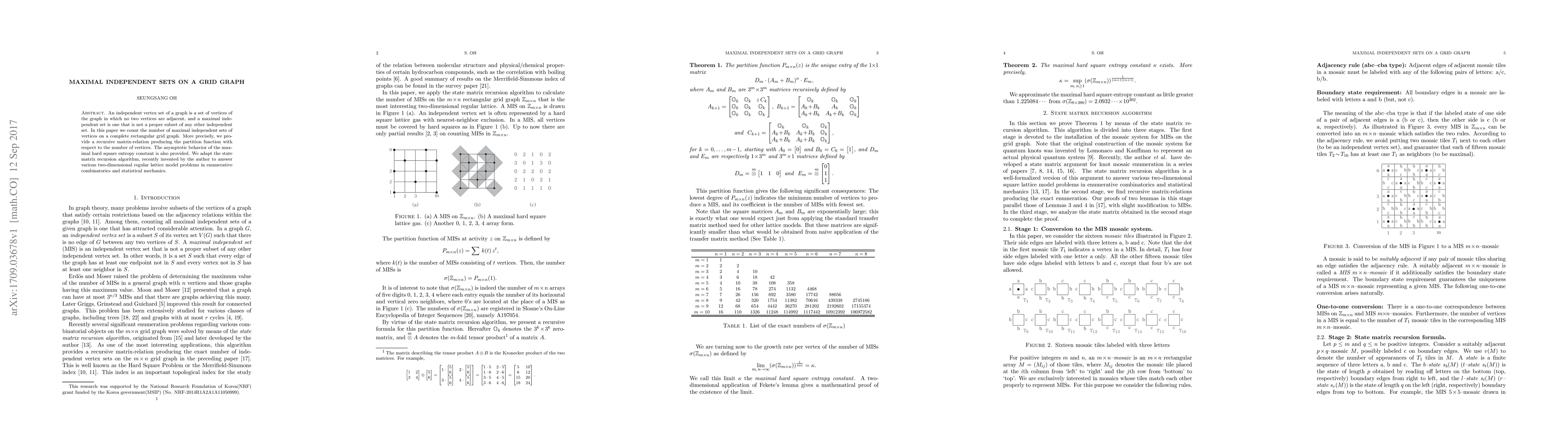 This paper counts the number of maximal independent sets on a complete rectangular grid graph, providing a recursive matrix-relation for the partition function. It also analyzes the asymptotic behavior of the maximal hard square entropy constant using a state matrix recursion algorithm.