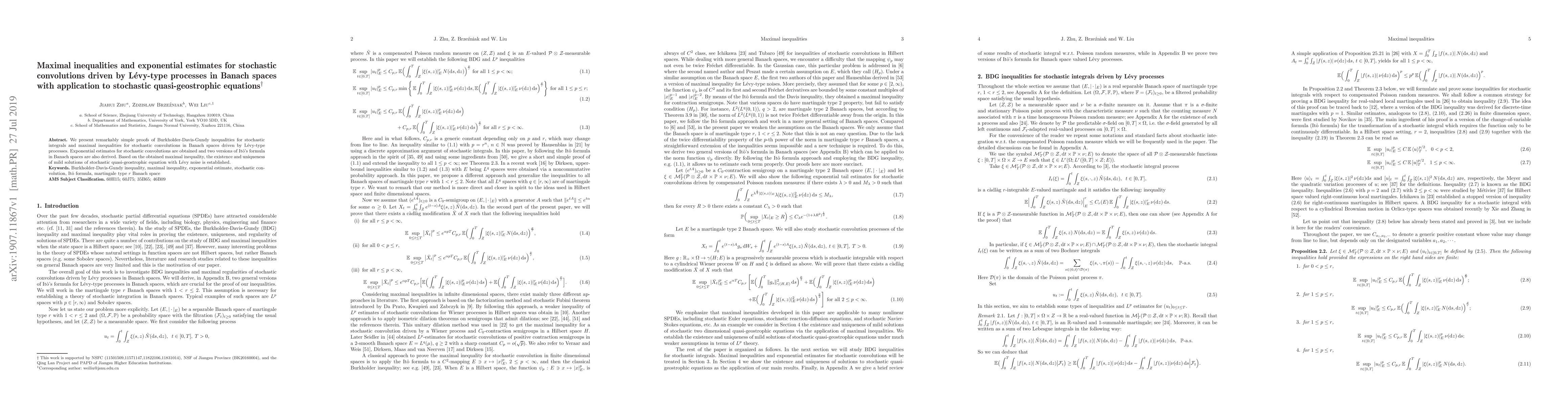This paper provides simple proofs for Burkholder-Davis-Gundy inequalities and maximal inequalities for stochastic convolutions in Banach spaces driven by Lévy-type processes, establishing exponential estimates and deriving two versions of Itô's formula. It also uses these results to prove the existence and uniqueness of mild solutions for stochastic quasi-geostrophic equations with Lévy noise.