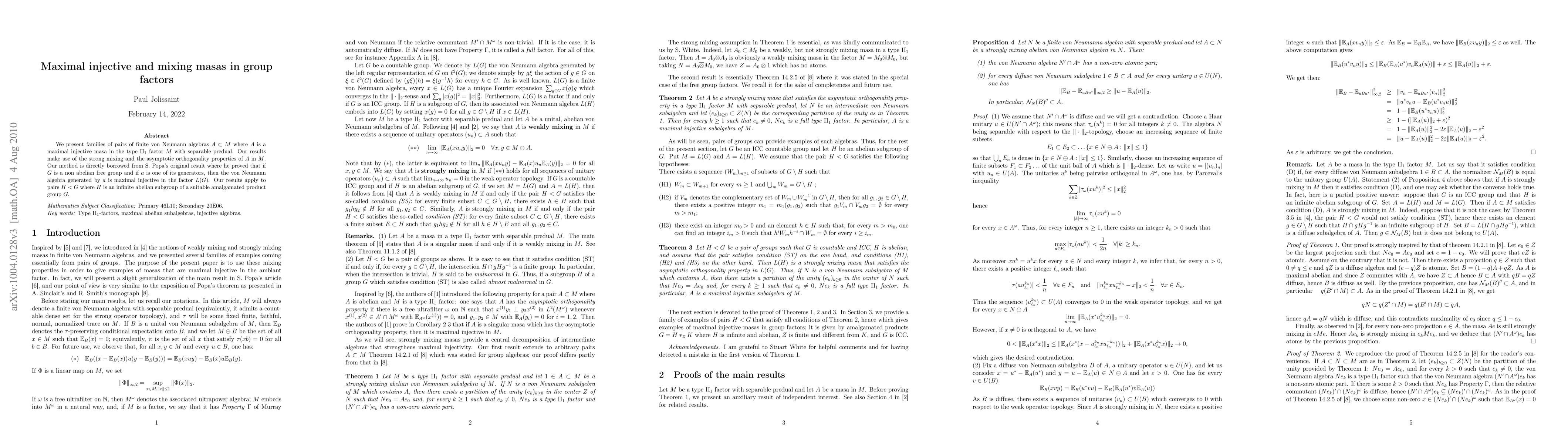 The paper introduces and proves properties of maximal injective and strongly mixing masas in group factors, building on S. Popa's work on free groups and extending it to more general settings.