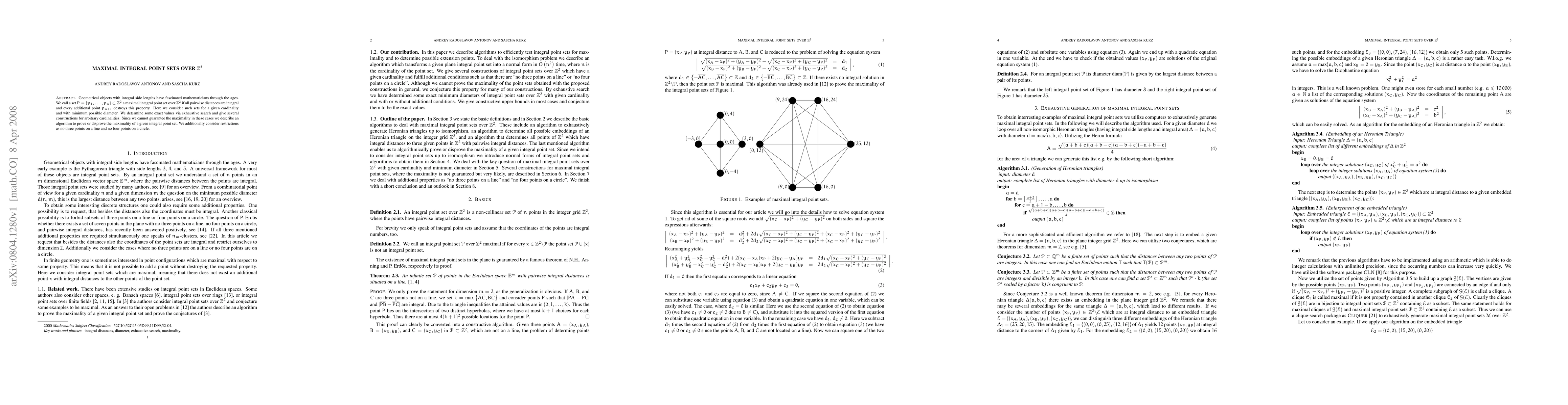 This paper explores maximal integral point sets in $\mathbb{Z}^2$ where all pairwise distances are integral, aiming to find sets with minimum diameter for given cardinalities. It provides constructions and an algorithm to verify maximality, and considers additional constraints like no three points on a line and no four on a circle.