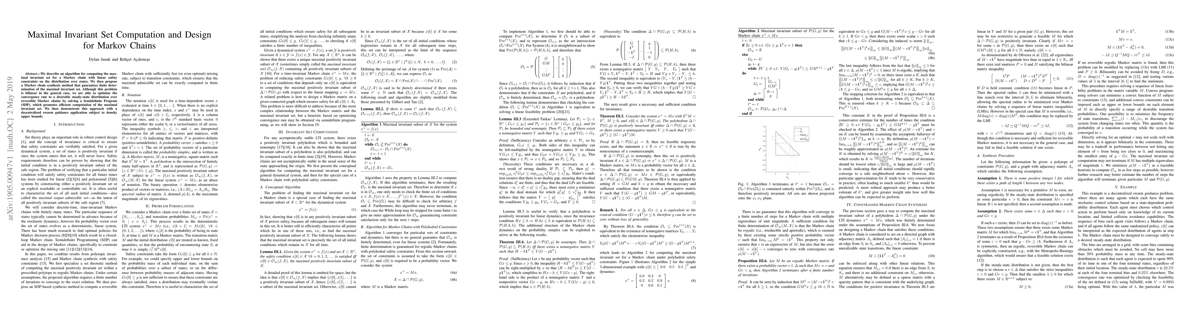The paper presents an algorithm for computing the maximal invariant set for Markov chains with linear safety constraints, ensuring finite determination through Semidefinite Programming (SDP) for efficient computation, particularly for reversible Markov chains.