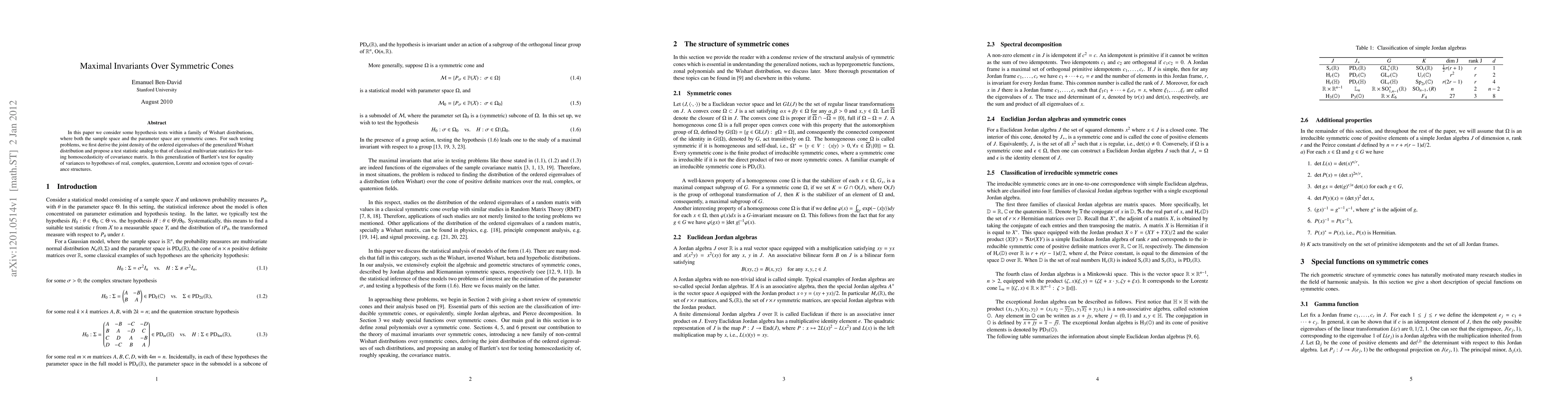In this paper we consider some hypothesis tests within a family of Wishart distributions, where both the sample space and the parameter space are symmetric cones. For such testing problems, we first derive the joint density of the ordered eigenvalues of the generalized Wishart distribution and propose a test statistic analog to that of classical multivariate statistics for testing homoscedasticity of covariance matrix. In this generalization of Bartlett's test for equality of variances to hypotheses of real, complex, quaternion, Lorentz and octonion types of covariance structures.