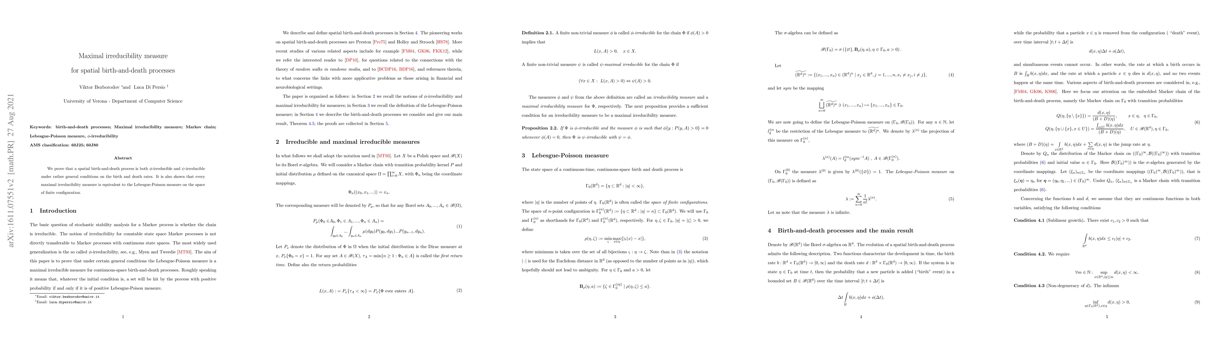 Summary: This paper demonstrates that under specified conditions on birth and death rates, the Lebesgue-Poisson measure serves as the maximal irreducibility measure for spatial birth-and-death processes. The findings establish the measure's role in characterizing the process's irreducibility.