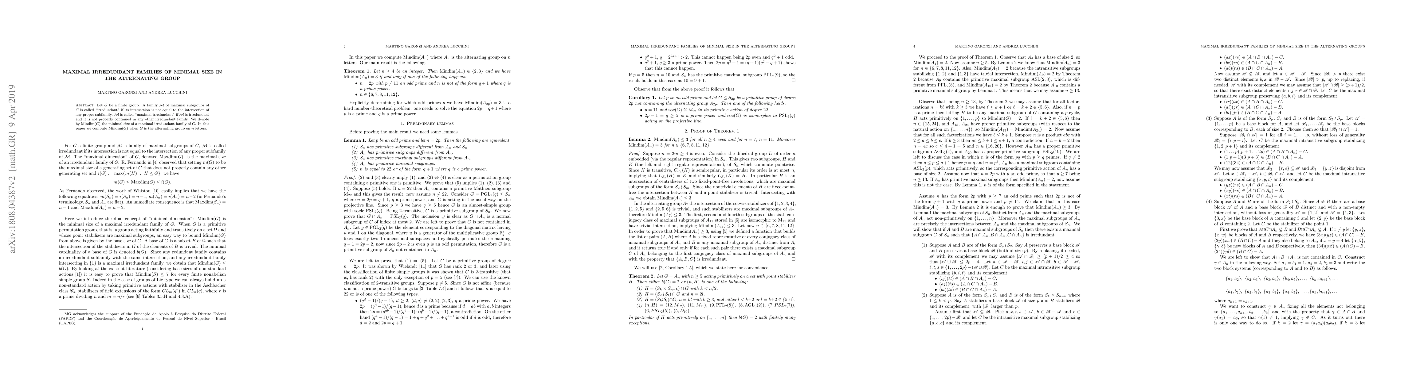 Let $G$ be a finite group. A family $\mathcal{M}$ of maximal subgroups of $G$ is called `irredundant' if its intersection is not equal to the intersection of any proper subfamily. $\mathcal{M}$ is called `maximal irredundant' if $\mathcal{M}$ is irredundant and it is not properly contained in any other irredundant family. We denote by $\mbox{Mindim}(G)$ the minimal size of a maximal irredundant family of $G$. In this paper we compute $\mbox{Mindim}(G)$ when $G$ is the alternating group on $n$ letters.