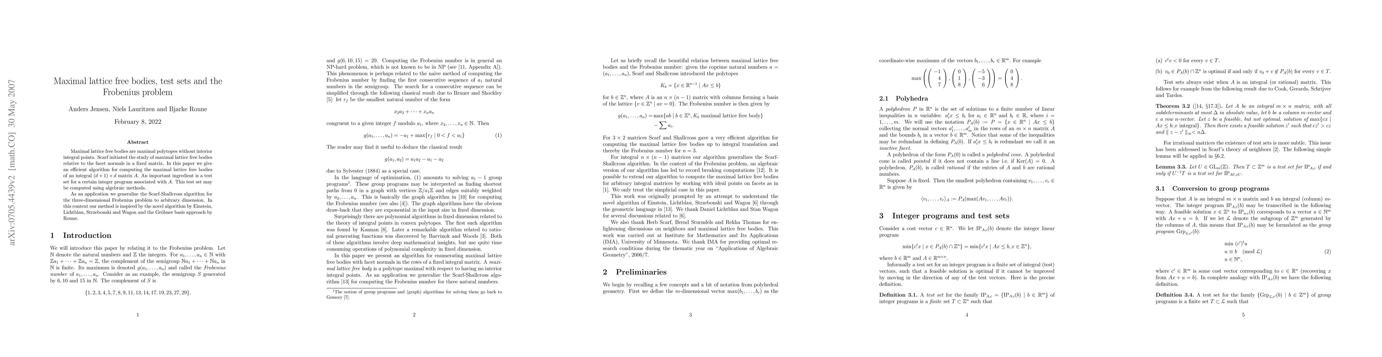 Maximal lattice free bodies are maximal polytopes without interior integral points. Scarf initiated the study of maximal lattice free bodies relative to the facet normals in a fixed matrix. In this paper we give an efficient algorithm for computing the maximal lattice free bodies of an integral matrix A. An important ingredient is a test set for a certain integer program associated with A. This test set may be computed using algebraic methods. As an application we generalize the Scarf-Shallcross algorithm for the three-dimensional Frobenius problem to arbitrary dimension. In this context our method is inspired by the novel algorithm by Einstein, Lichtblau, Strzebonski and Wagon and the Groebner basis approach by Roune.