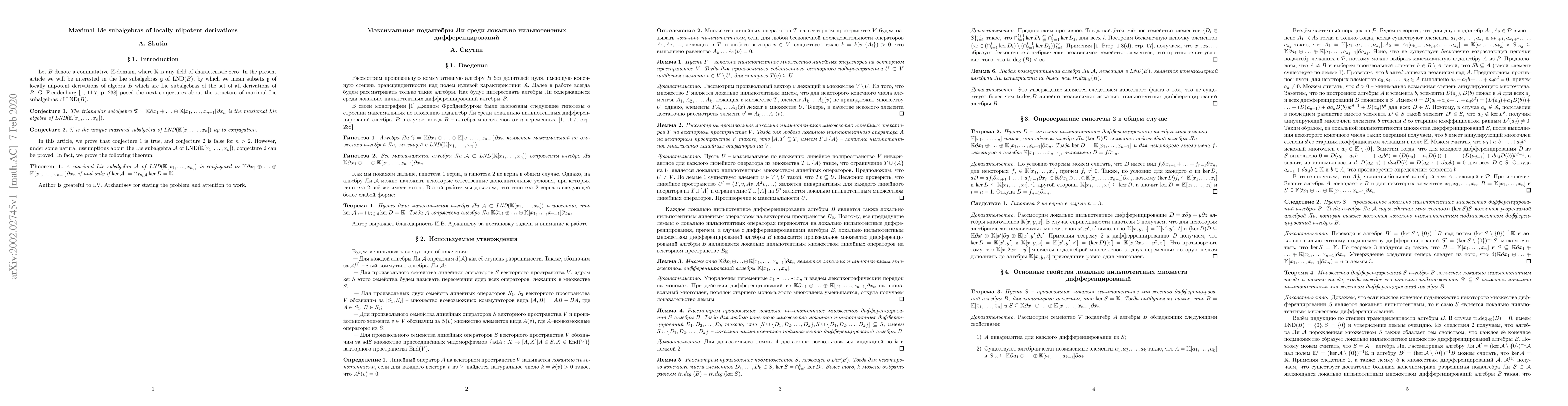 This research confirms that the triangular Lie algebra is the largest within the set of locally nilpotent derivations of a polynomial ring, proving the first part of Freudenburg's conjecture. However, it disproves the second part by providing a counterexample, and it shows that the second conjecture holds for maximal Lie algebras with certain additional properties.