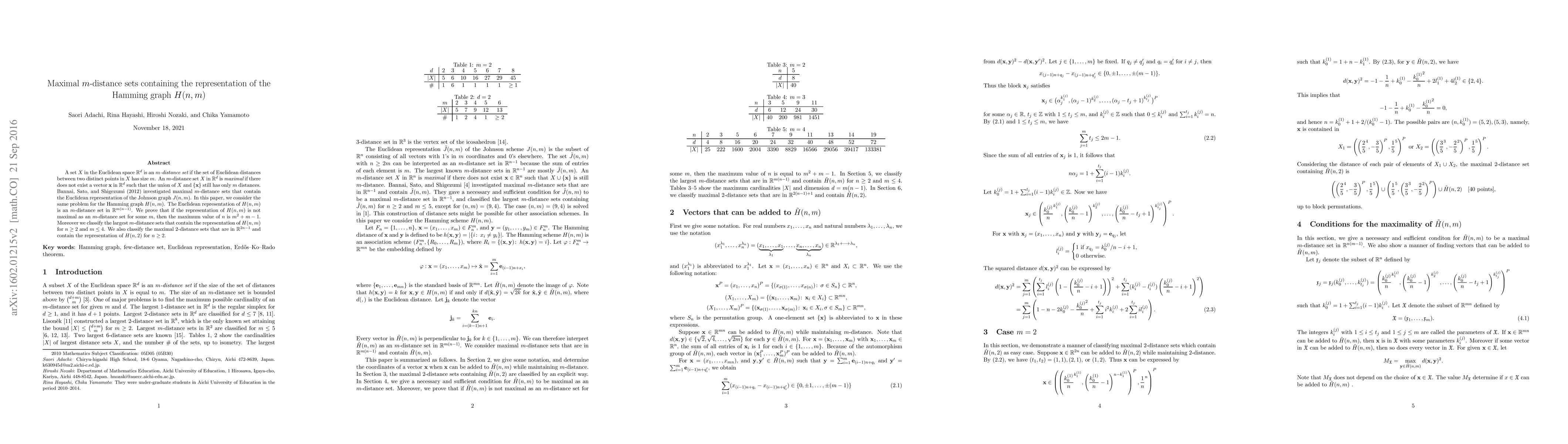This paper investigates maximal $m$-distance sets containing the Euclidean representation of the Hamming graph $H(n,m)$. It proves that the representation of $H(n,m)$ is not maximal when $n > m^2 + m - 1$ and classifies the largest $m$-distance sets for $m \leq 4$ and any $n$.