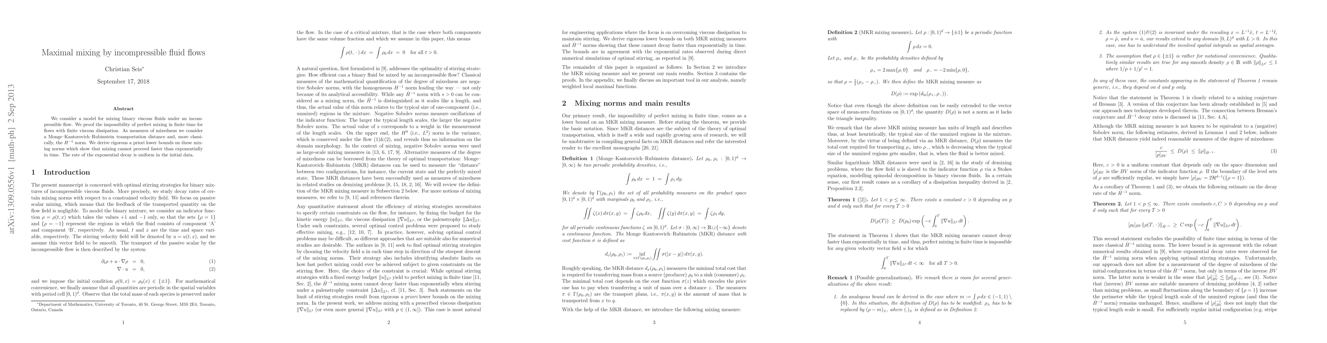 We consider a model for mixing binary viscous fluids under an incompressible flow. We proof the impossibility of perfect mixing in finite time for flows with finite viscous dissipation. As measures of mixedness we consider a Monge--Kantorovich--Rubinstein transportation distance and, more classically, the $H^{-1}$ norm. We derive rigorous a priori lower bounds on these mixing norms which show that mixing cannot proceed faster than exponentially in time. The rate of the exponential decay is uniform in the initial data.