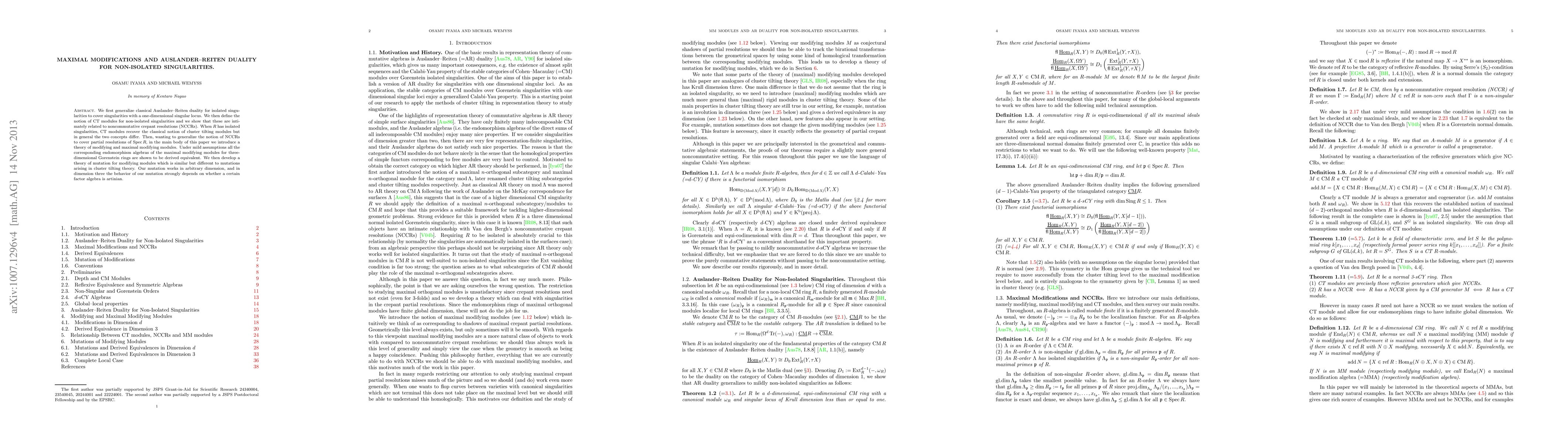 This paper generalizes Auslander-Reiten duality to non-isolated singularities, introduces CT modules for such singularities, and relates them to noncommutative crepant resolutions. It develops a theory of modifying and maximal modifying modules, showing derived equivalence for endomorphism algebras in three-dimensional Gorenstein rings, and proposes a mutation theory for modifying modules applicable in any dimension.
