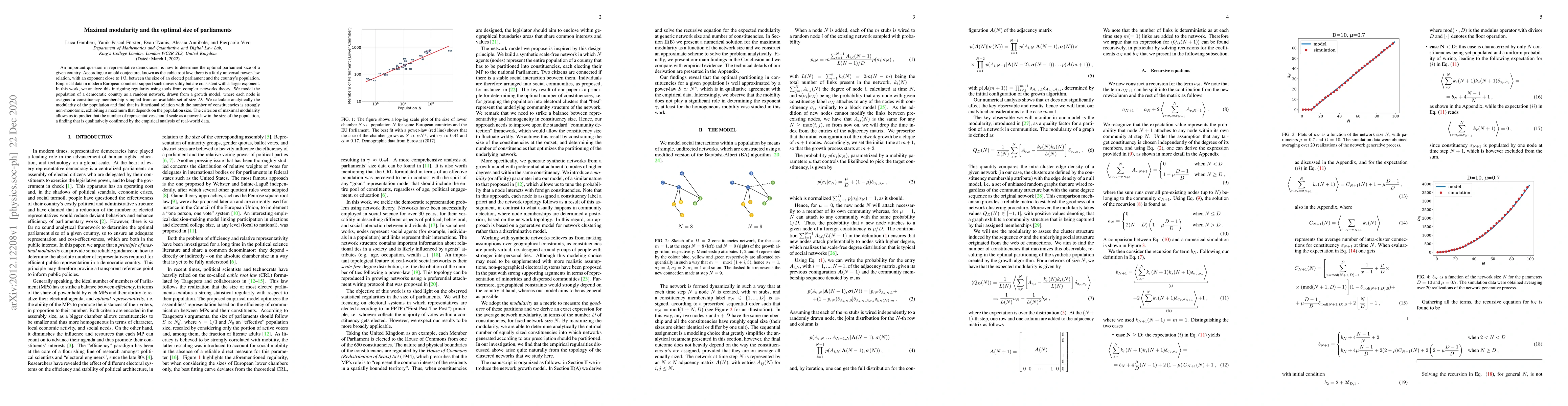 An important question in representative democracies is how to determine the optimal parliament size of a given country. According to an old conjecture, known as the cubic root law, there is a fairly universal power-law relation, with an exponent close to 1/3, between the size of an elected parliament and the country's population. Empirical data in modern European countries support such universality but are consistent with a larger exponent. In this work, we analyze this intriguing regularity using tools from complex networks theory. We model the population of a democratic country as a random network, drawn from a growth model, where each node is assigned a constituency membership sampled from an available set of size $D$. We calculate analytically the modularity of the population and find that its functional relation with the number of constituencies is strongly non-monotonic, exhibiting a maximum that depends on the population size. The criterion of maximal modularity allows us to predict that the number of representatives should scale as a power-law in the size of the population, a finding that is qualitatively confirmed by the empirical analysis of real-world data.