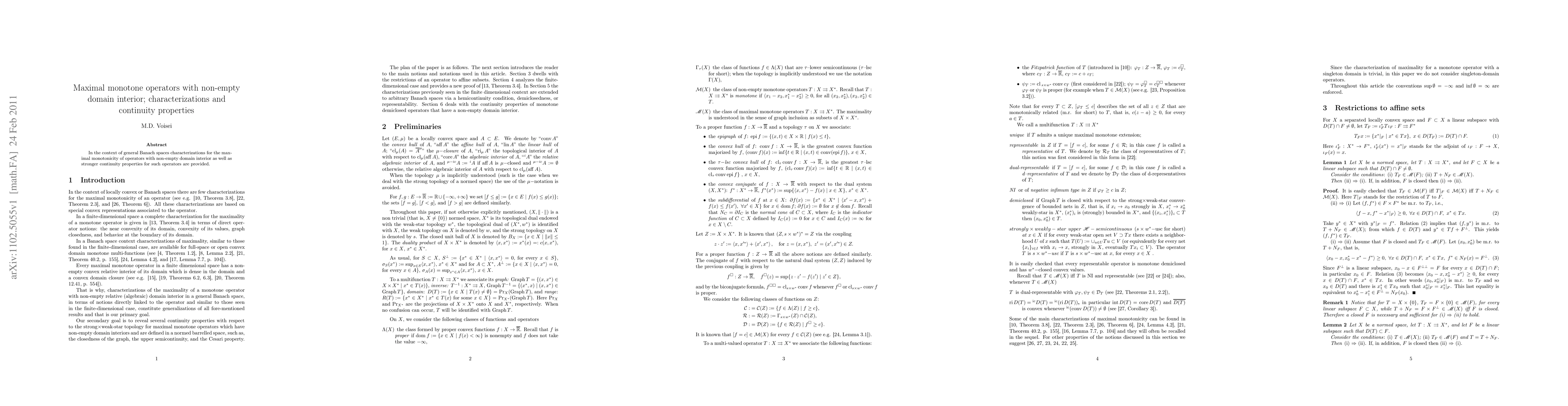 This paper provides characterizations for maximal monotonicity of operators with non-empty domain interior in Banach spaces, as well as stronger continuity properties.