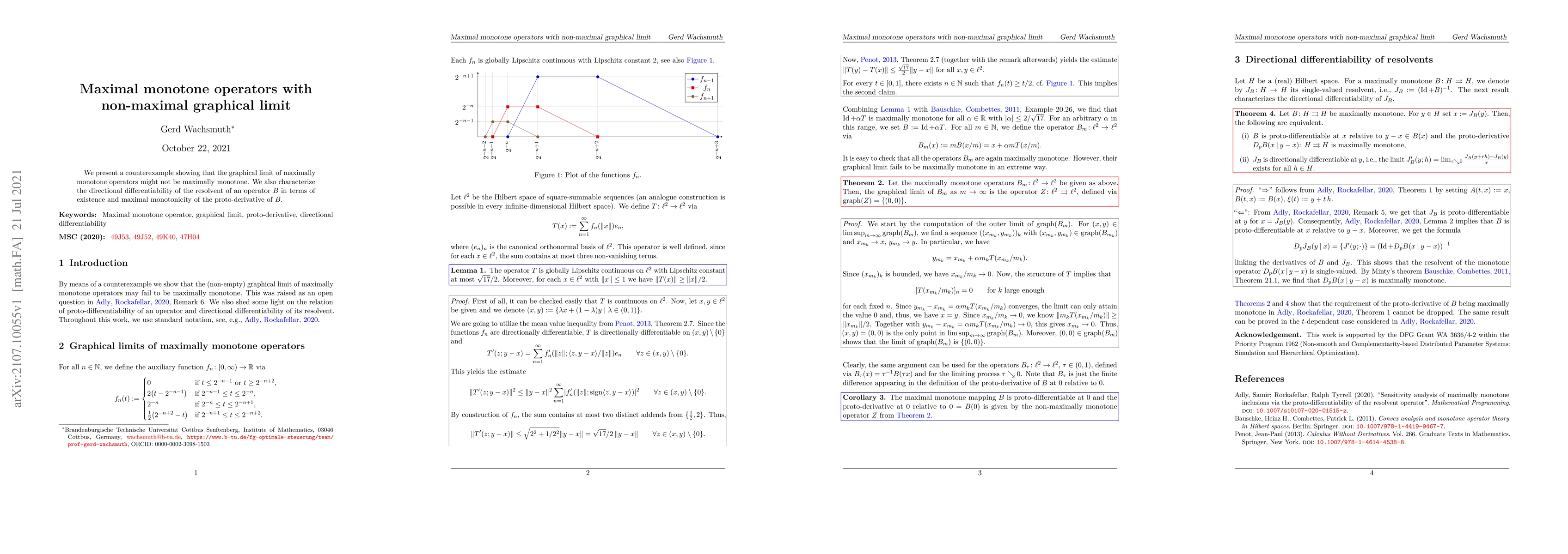 This paper provides a counterexample demonstrating that the graphical limit of maximally monotone operators need not remain maximally monotone. Additionally, it explores the directional differentiability of the resolvent of an operator $B$ based on the existence and maximal monotonicity of the proto-derivative of $B$.