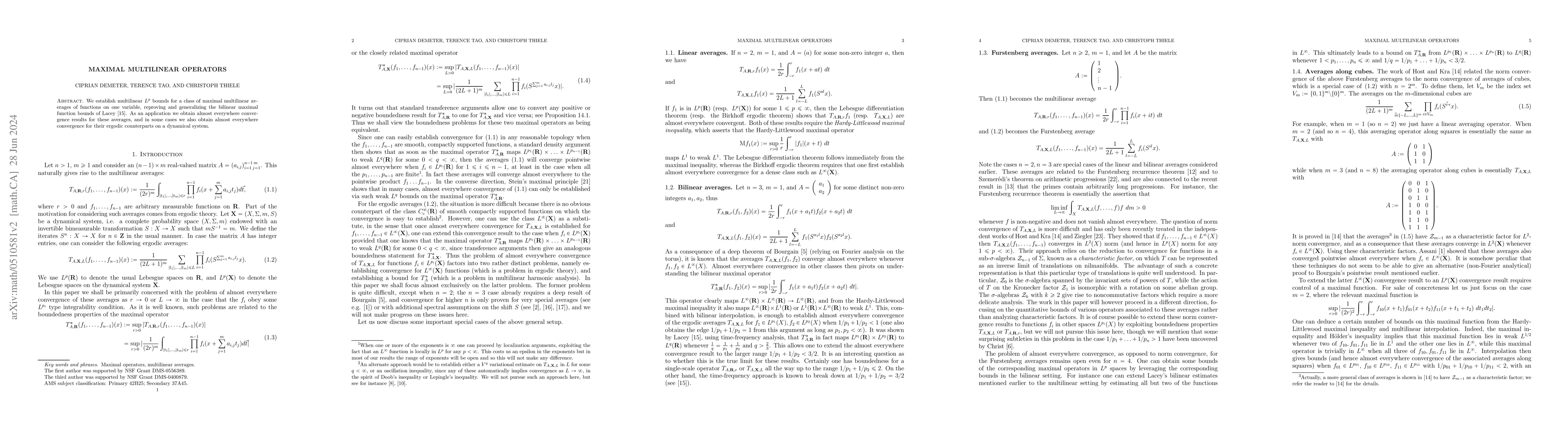 The paper establishes multilinear L^p bounds for maximal multilinear averages of functions on one variable, generalizing previous bounds by Lacey.