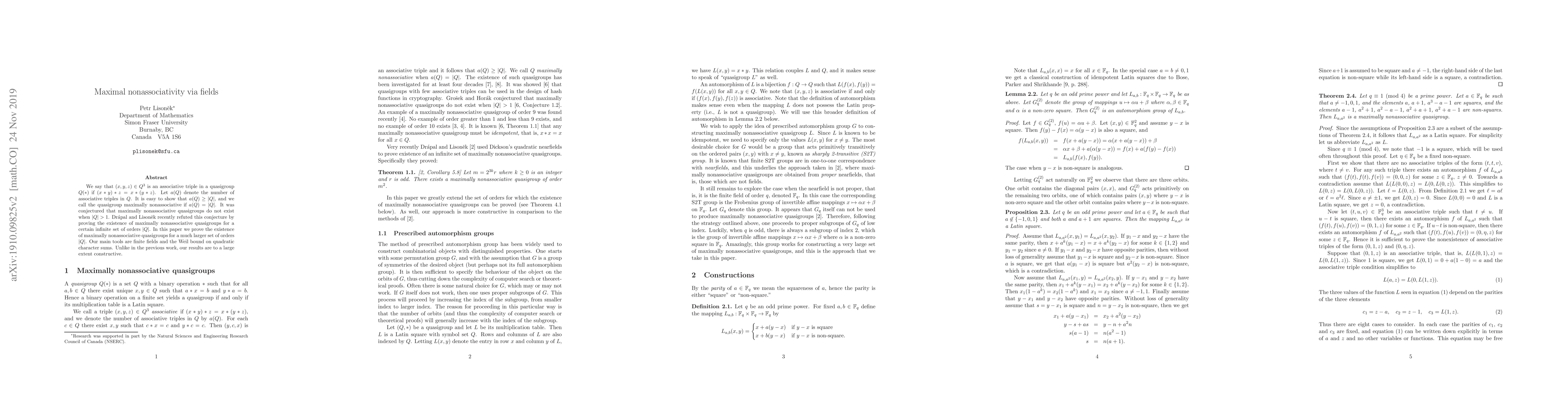 We say that $(x,y,z)\in Q^3$ is an associative triple in a quasigroup $Q(*)$ if $(x*y)*z=x*(y*z)$. Let $a(Q)$ denote the number of associative triples in $Q$. It is easy to show that $a(Q)\ge |Q|$, and we call the quasigroup maximally nonassociative if $a(Q)= |Q|$. It was conjectured that maximally nonassociative quasigroups do not exist when $|Q|>1$. Dr\'apal and Lison\v{e}k recently refuted this conjecture by proving the existence of maximally nonassociative quasigroups for a certain infinite set of orders $|Q|$. In this paper we prove the existence of maximally nonassociative quasigroups for a much larger set of orders $|Q|$. Our main tools are finite fields and the Weil bound on quadratic character sums. Unlike in the previous work, our results are to a large extent constructive.