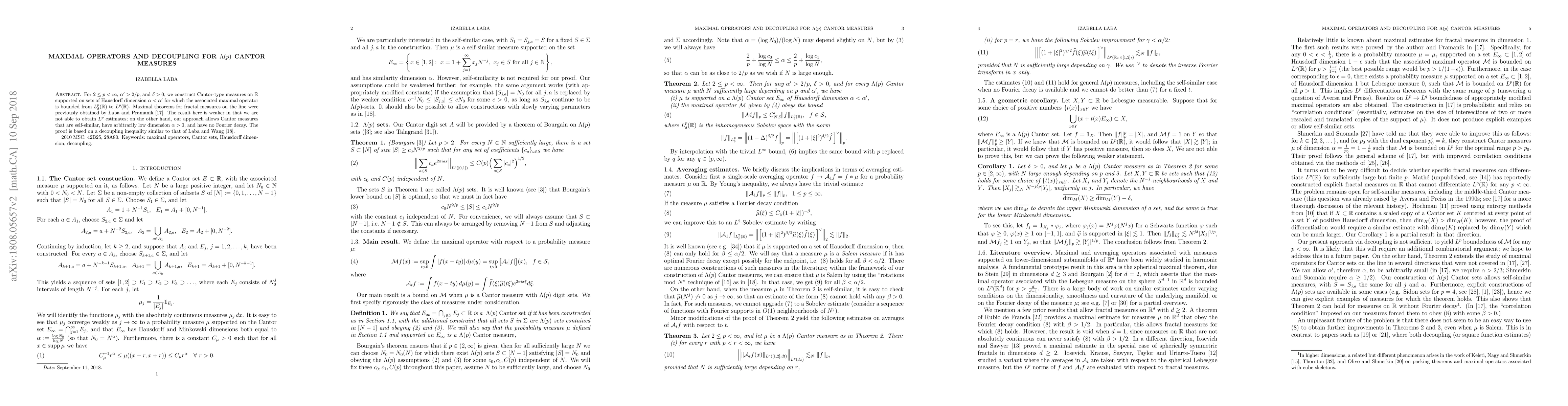 This paper constructs Cantor measures with low Hausdorff dimension that satisfy a bounded maximal operator from $L^p_\delta$ to $L^p$, extending previous results by Laba and Pramanik. Unlike prior work, it allows self-similarity, arbitrarily low dimension, and no Fourier decay, using a decoupling inequality approach.