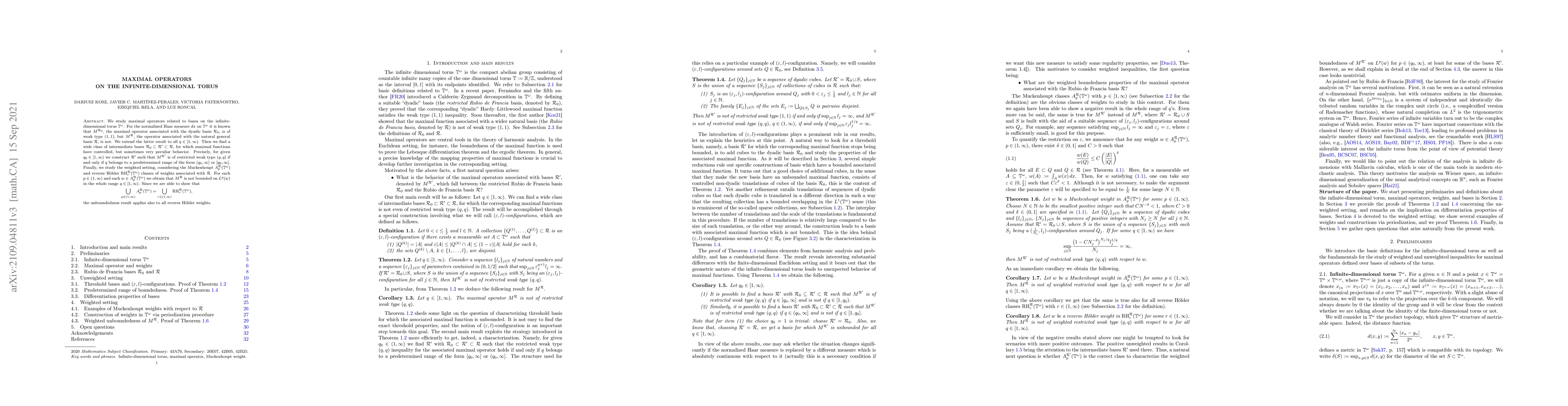 We study maximal operators related to bases on the infinite-dimensional torus $\mathbb{T}^\omega$. {For the normalized Haar measure $dx$ on $\mathbb{T}^\omega$ it is known that $M^{\mathcal{R}_0}$, the maximal operator associated with the dyadic basis $\mathcal{R}_0$, is of weak type $(1,1)$, but $M^{\mathcal{R}}$, the operator associated with the natural general basis $\mathcal{R}$, is not. We extend the latter result to all $q \in [1,\infty)$. Then we find a wide class of intermediate bases $\mathcal{R}_0 \subset \mathcal{R}' \subset \mathcal{R}$, for which maximal functions have controlled, but sometimes very peculiar behavior.} Precisely, for given $q_0 \in [1, \infty)$ we construct $\mathcal{R}'$ such that $M^{\mathcal{R}'}$ is of restricted weak type $(q,q)$ if and only if $q$ belongs to a predetermined range of the form $(q_0, \infty]$ or $[q_0, \infty]$. Finally, we study the weighted setting, considering the Muckenhoupt $A_p^\mathcal{R}(\mathbb{T}^\omega)$ and reverse H\"older $\mathrm{RH}_r^\mathcal{R}(\mathbb{T}^\omega)$ classes of weights associated with $\mathcal{R}$. For each $p \in (1, \infty)$ and each $w \in A_p^\mathcal{R}(\mathbb{T}^\omega)$ we obtain that $M^{\mathcal{R}}$ is not bounded on $L^q(w)$ in the whole range $q \in [1,\infty)$. Since we are able to show that \[ \bigcup_{p \in (1, \infty)}A_p^\mathcal{R}(\mathbb{T}^\omega) = \bigcup_{r \in (1, \infty)} \mathrm{RH}_r^\mathcal{R}(\mathbb{T}^\omega), \] the unboundedness result applies also to all reverse H\"older weights.