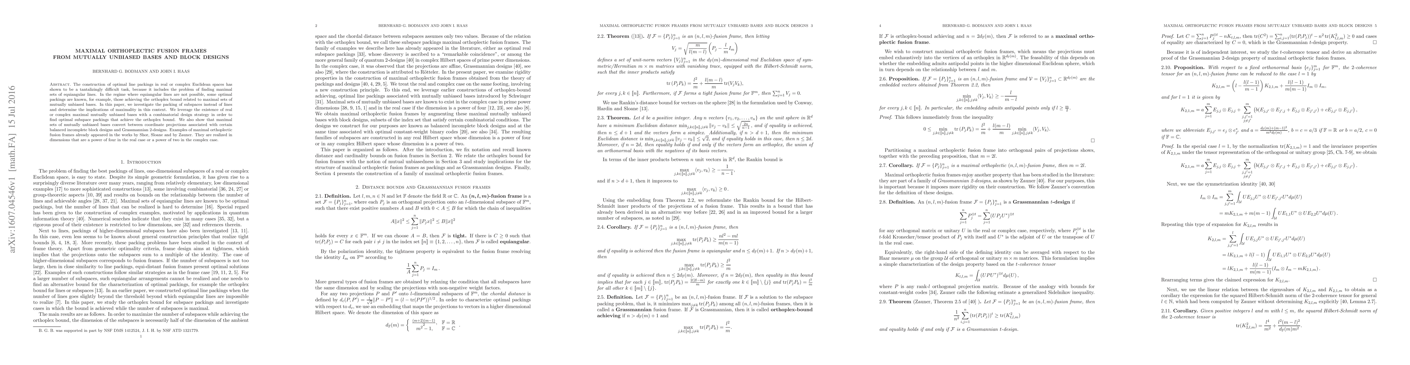 This paper explores optimal packings of subspaces in Euclidean spaces, focusing on maximal orthoplex packings achieved through maximal mutually unbiased bases. It demonstrates how these bases relate to balanced incomplete block designs and Grassmannian 2-designs, providing a combinatorial approach to achieving the orthoplex bound.